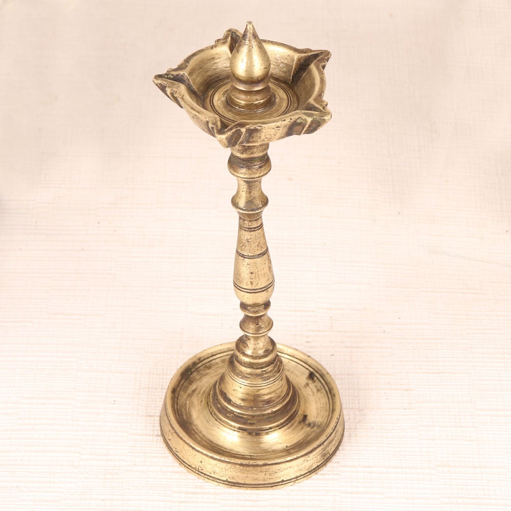 This Vintage Brass Oil Lamp is a timeless masterpiece meticulously handcrafted by skilled Indian artisans. This magnificent piece showcases the rich heritage of South Indian artistry, crafted from premium-quality brass. Its antique brown finish adds a touch of vintage charm that effortlessly complements any setting, making it the perfect addition to your home, office, restaurant, hotel, shop, or cafe. This versatile lamp serves both a functional and decorative purpose. It can grace your prayer room, infusing spiritual ambiance with its radiant glow, and also elevate the aesthetic of any space with its antique allure. For collectors of vintage treasures, this lamp is a must-have and its elegance shines when displayed at exhibitions. One of its exceptional features is the ability to light up to five jyots simultaneously. Fill it with mustard oil or ghee, place cotton wicks, and watch as it illuminates your surroundings with a warm and comforting glow during special occasions or daily rituals. Gift this Vintage Brass Oil Lamp to your loved ones on special, festive, or auspicious occasions, symbolizing the timeless tradition and craftsmanship of India.