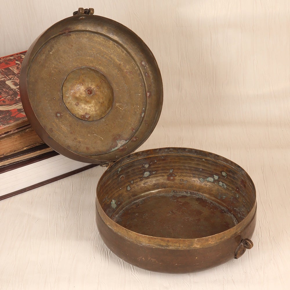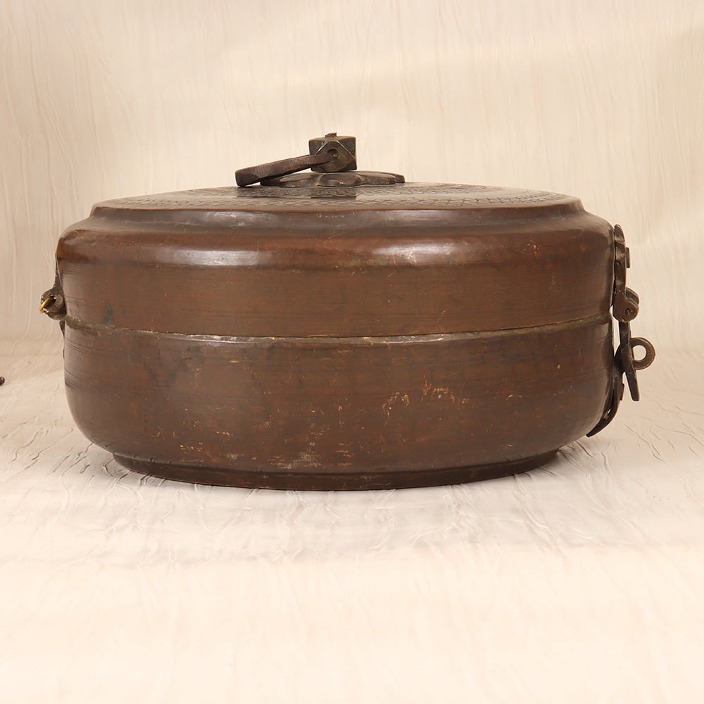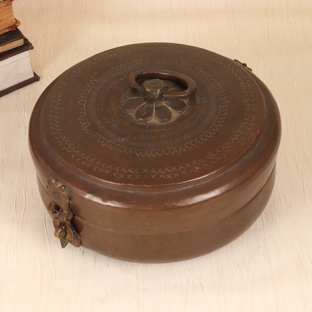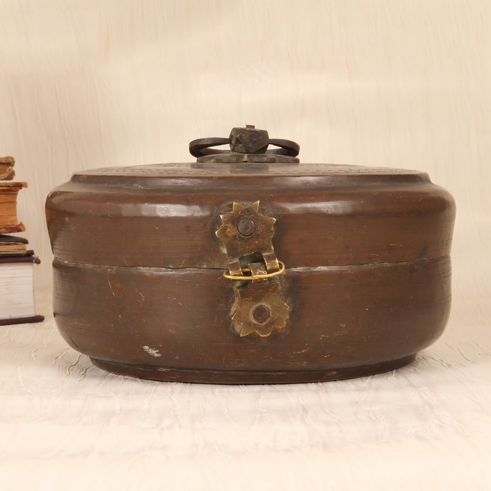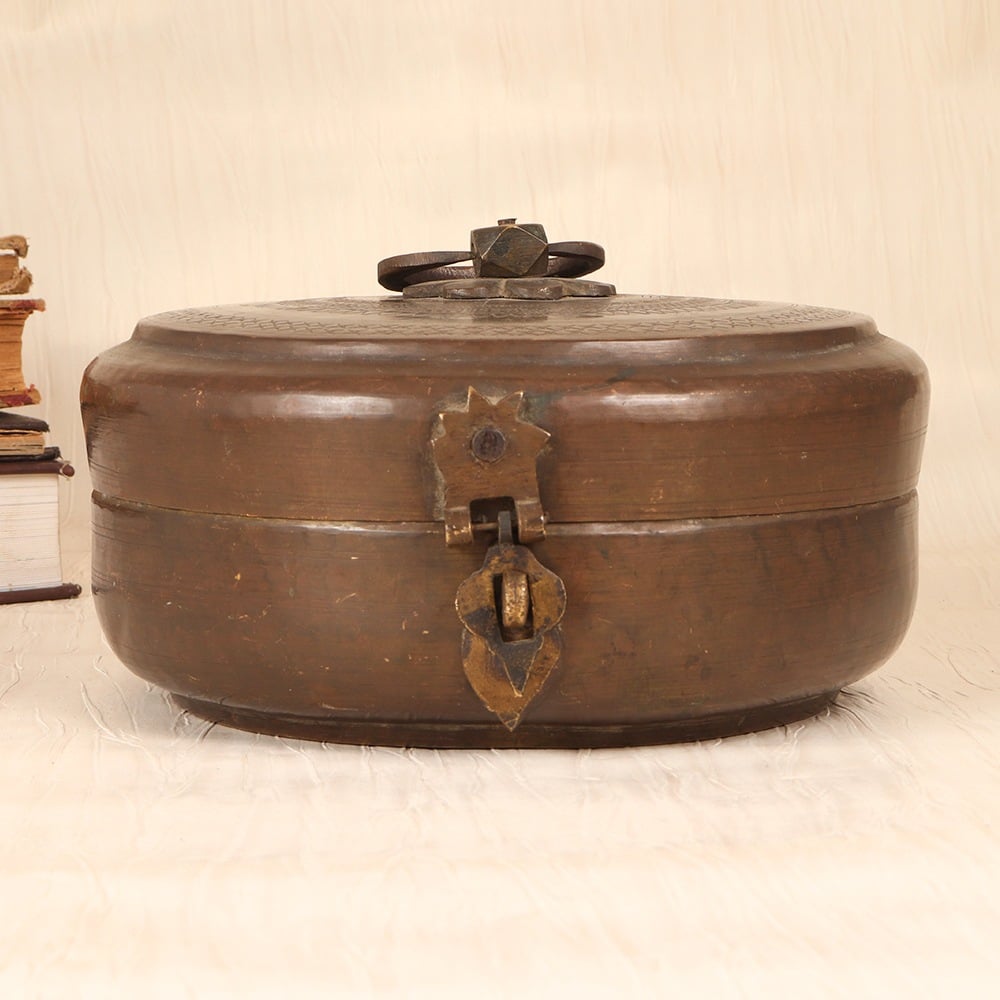 This exquisite vintage brass Chapati box is a true work of art, infusing any space with the rich cultural heritage of Rajasthan. Meticulously crafted by skilled artisans, the intricate engraving showcases the region's renowned artistic traditions. More than just a storage container, this piece doubles as a stunning decorative accent, elevating your décor with its timeless elegance. Constructed from durable brass, this Chapati box is built to last, maintaining its lustrous beauty for years to come. The vintage finish lends an air of antique charm, seamlessly blending modern and traditional aesthetics. Whether displayed on a shelf, table, or sideboard, this unique item is sure to draw admiring glances and spark conversations about its origins. This makes it the perfect addition to the home of the discerning décor enthusiast who appreciates fine craftsmanship and cherishes items with a rich history. Invest in a piece that will infuse your living space with the vibrant cultural essence of Rajasthan.