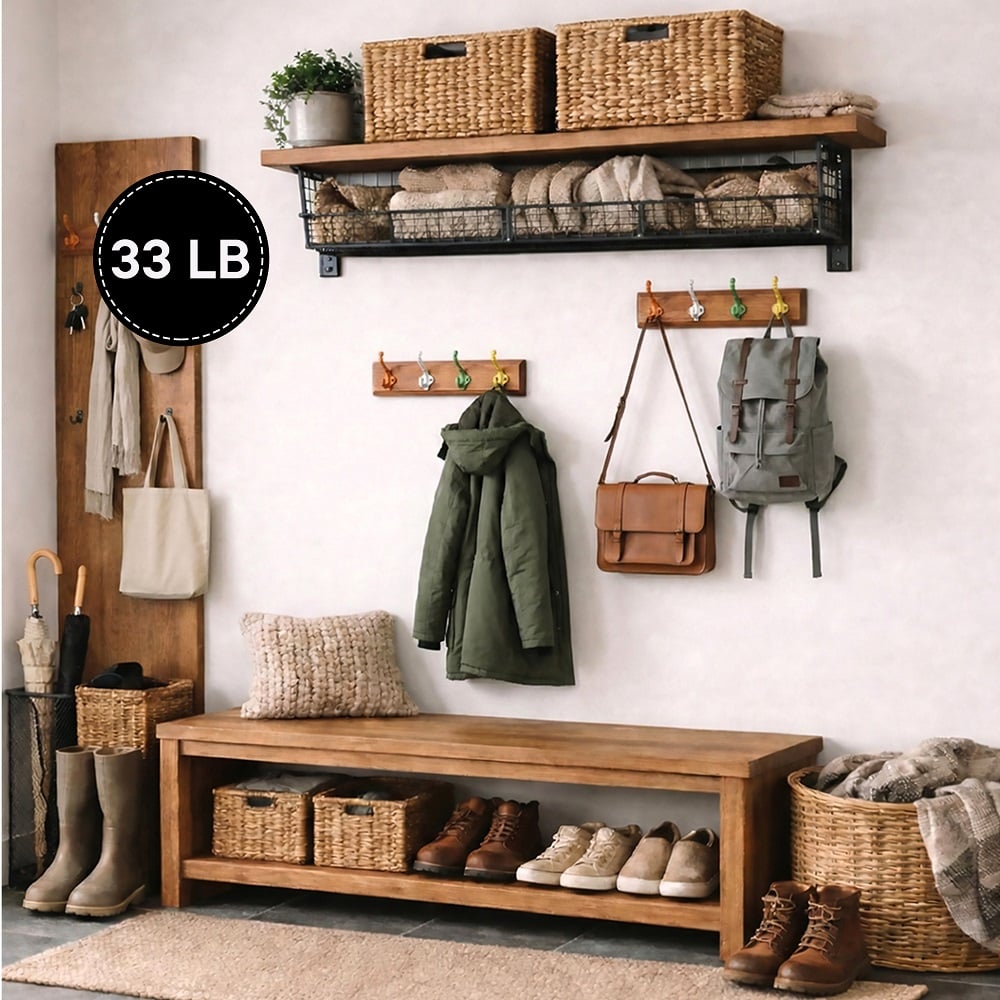 - Heavy-duty hooks designed to hold coats, towels, bags, keys, and accessories