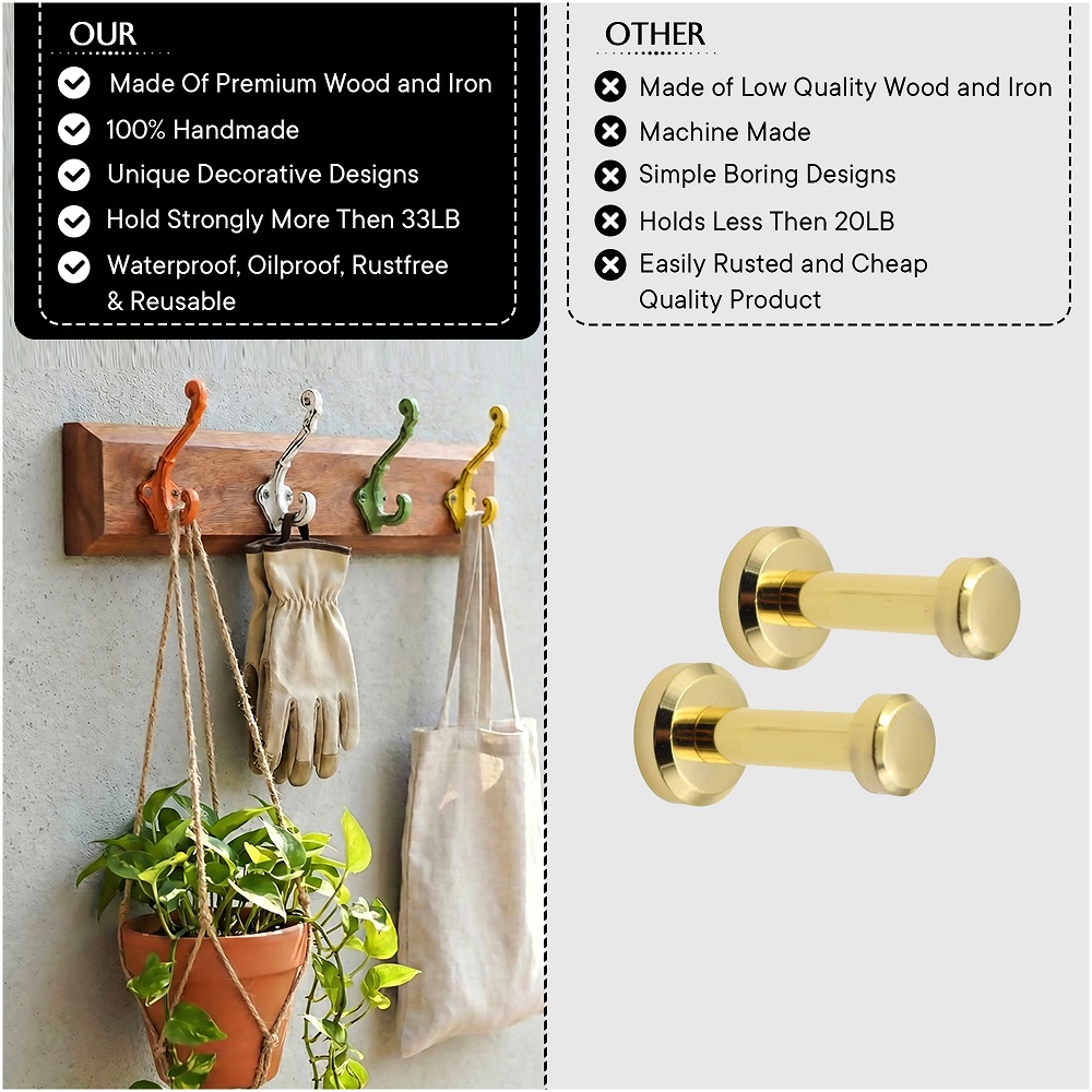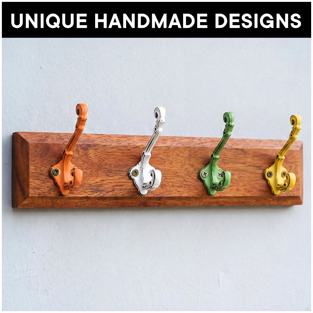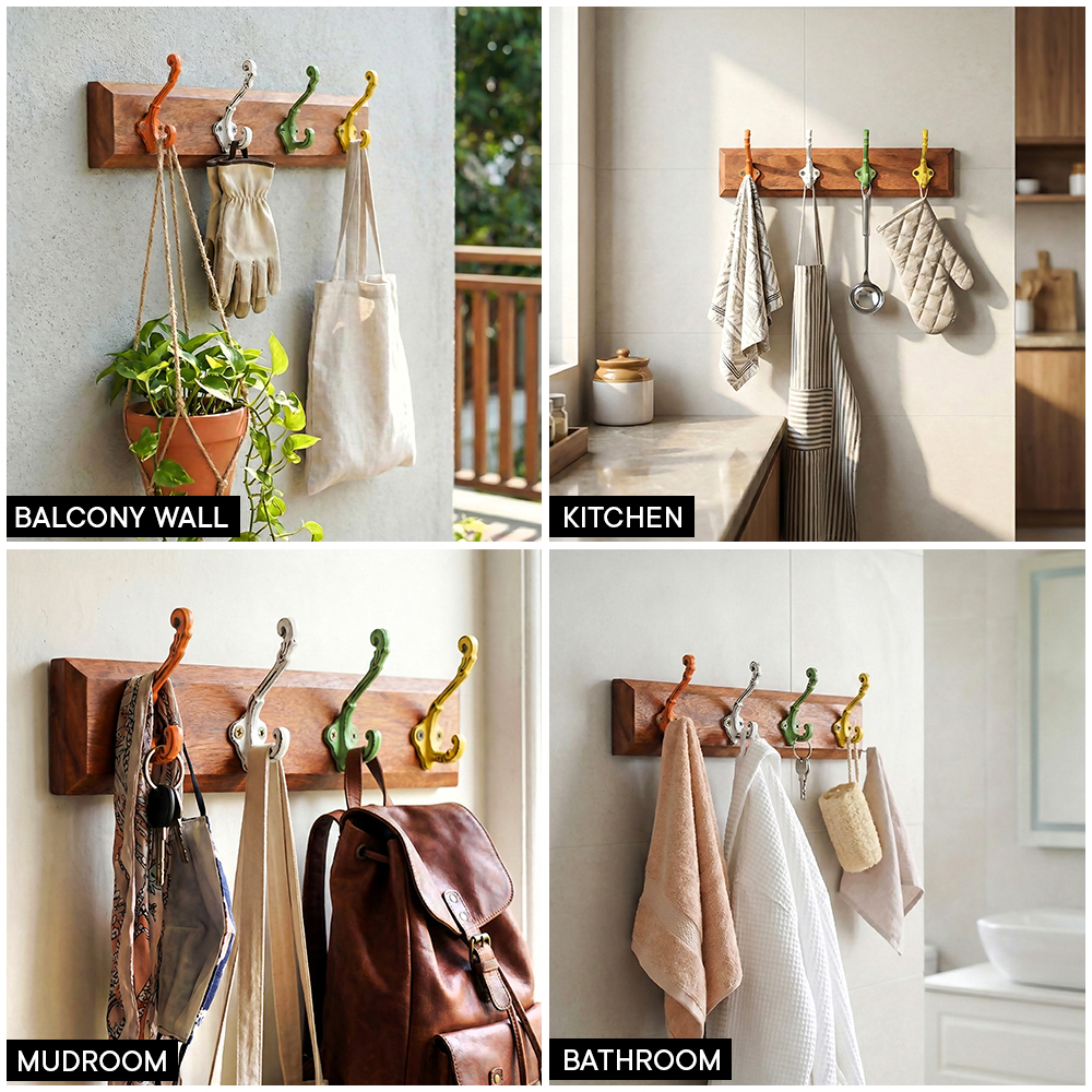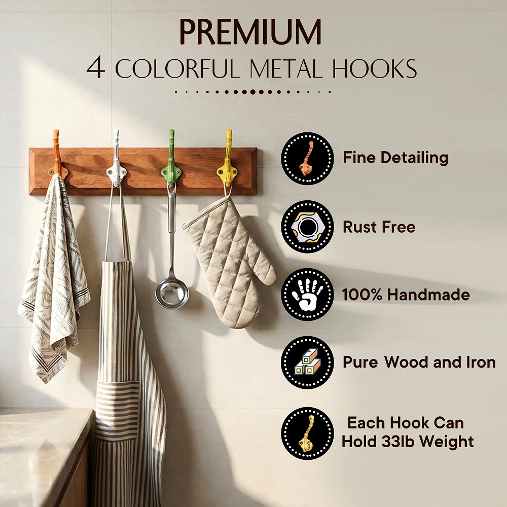 Add charm and functionality to your space with this handcrafted wooden wall hook rack. Made with a solid natural wood base and fitted with four sturdy, vintage-style metal hooks in vibrant colors, this wall-mounted organizer is perfect for keeping your everyday essentials neatly arranged. Ideal for entryways, bathrooms, kitchens, balconies, or bedrooms, it blends rustic warmth with a playful, modern touch. Strong, durable, and stylish, it enhances both dcor and storage in one simple solution.