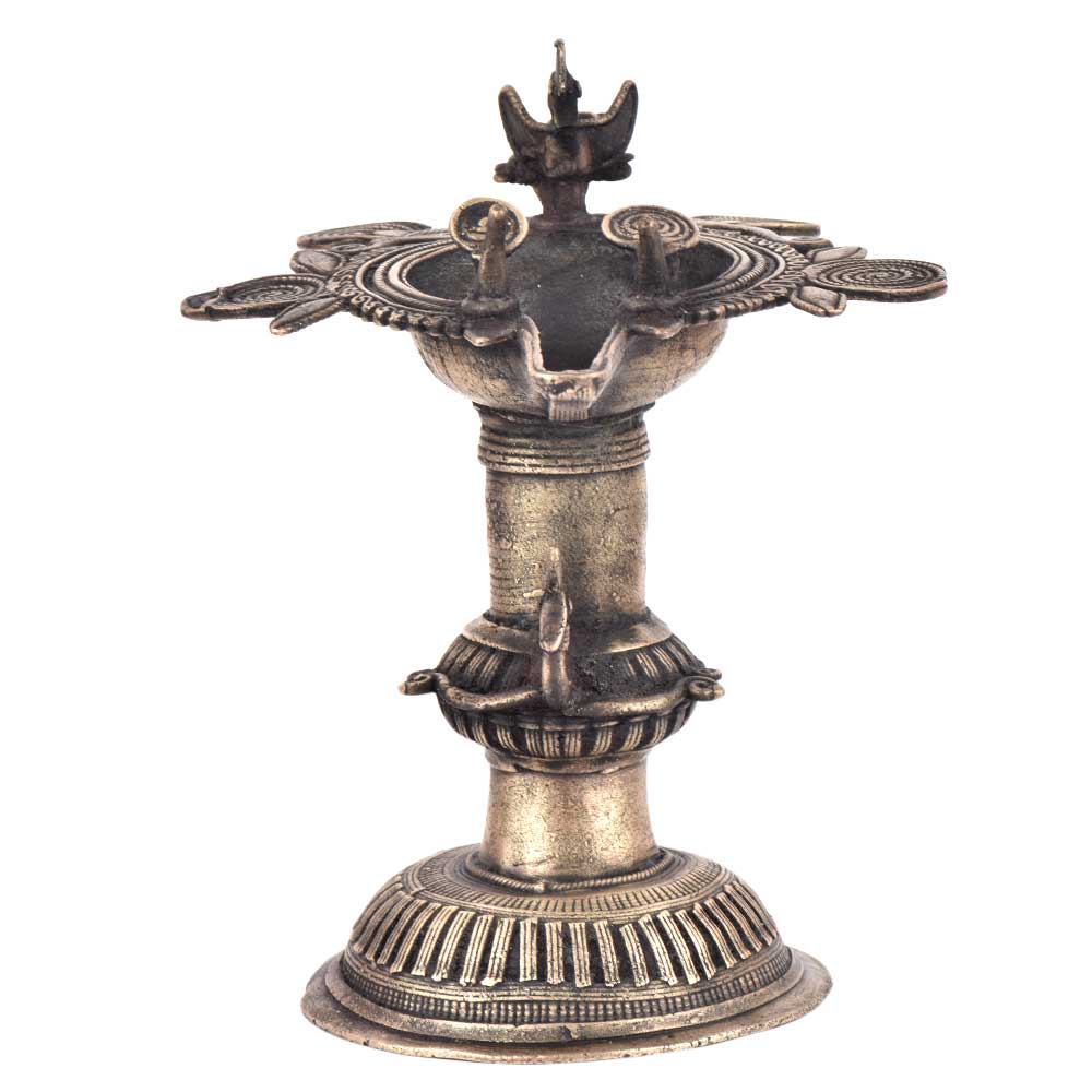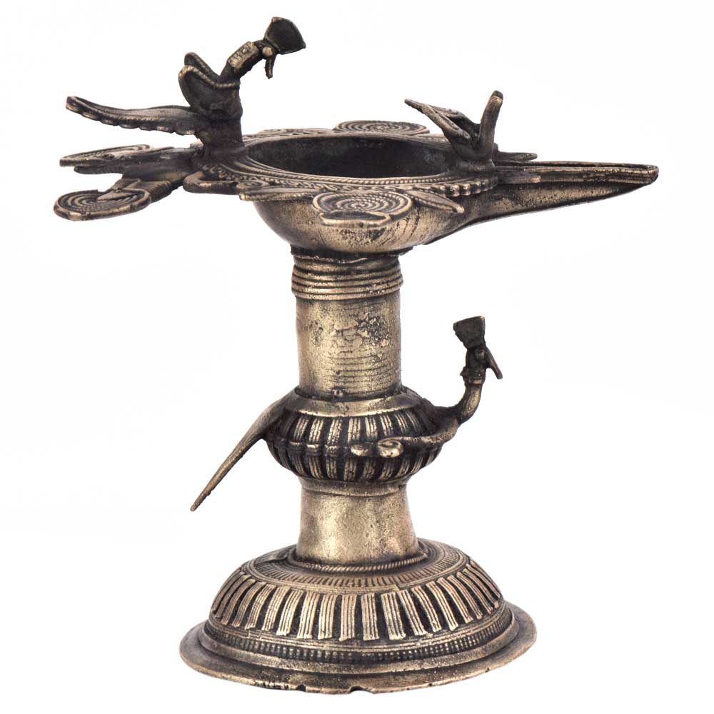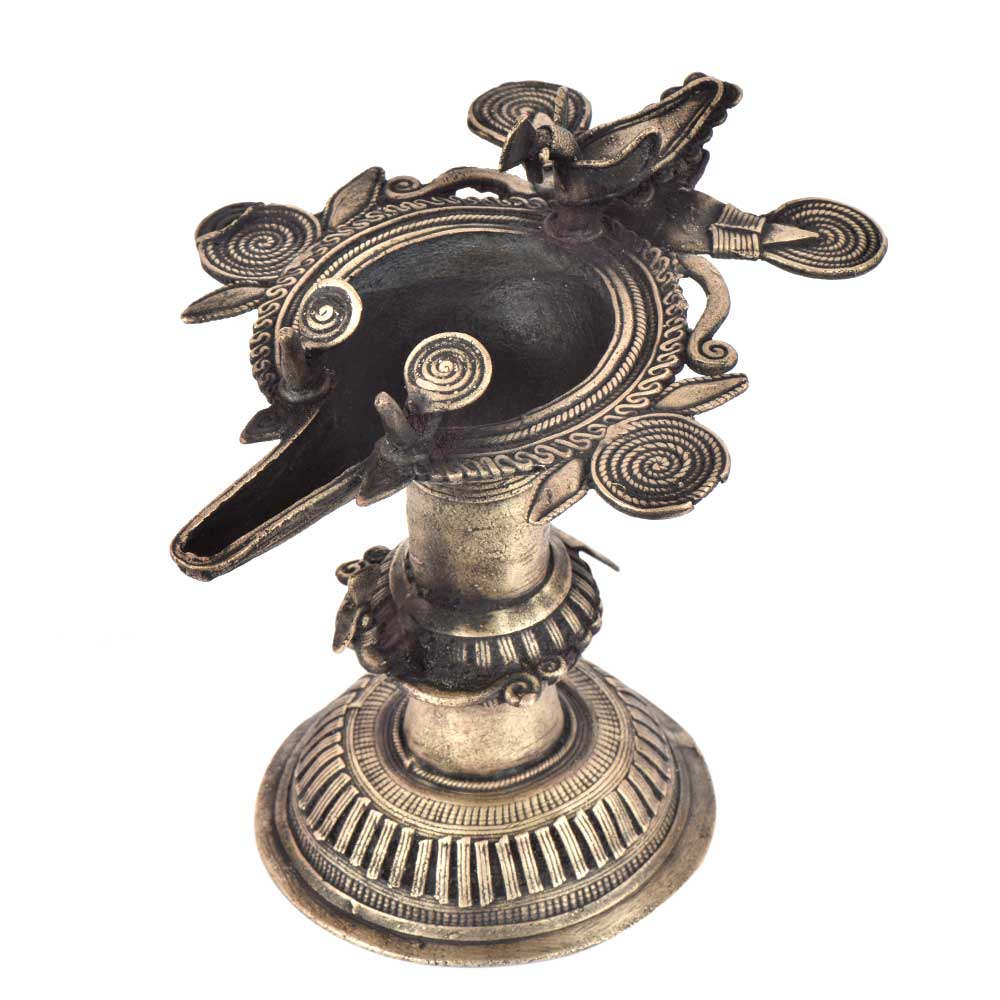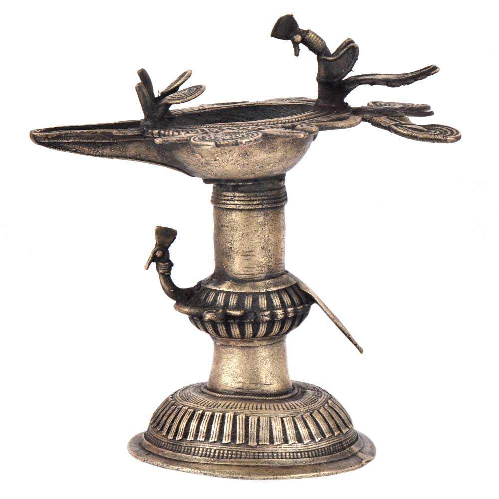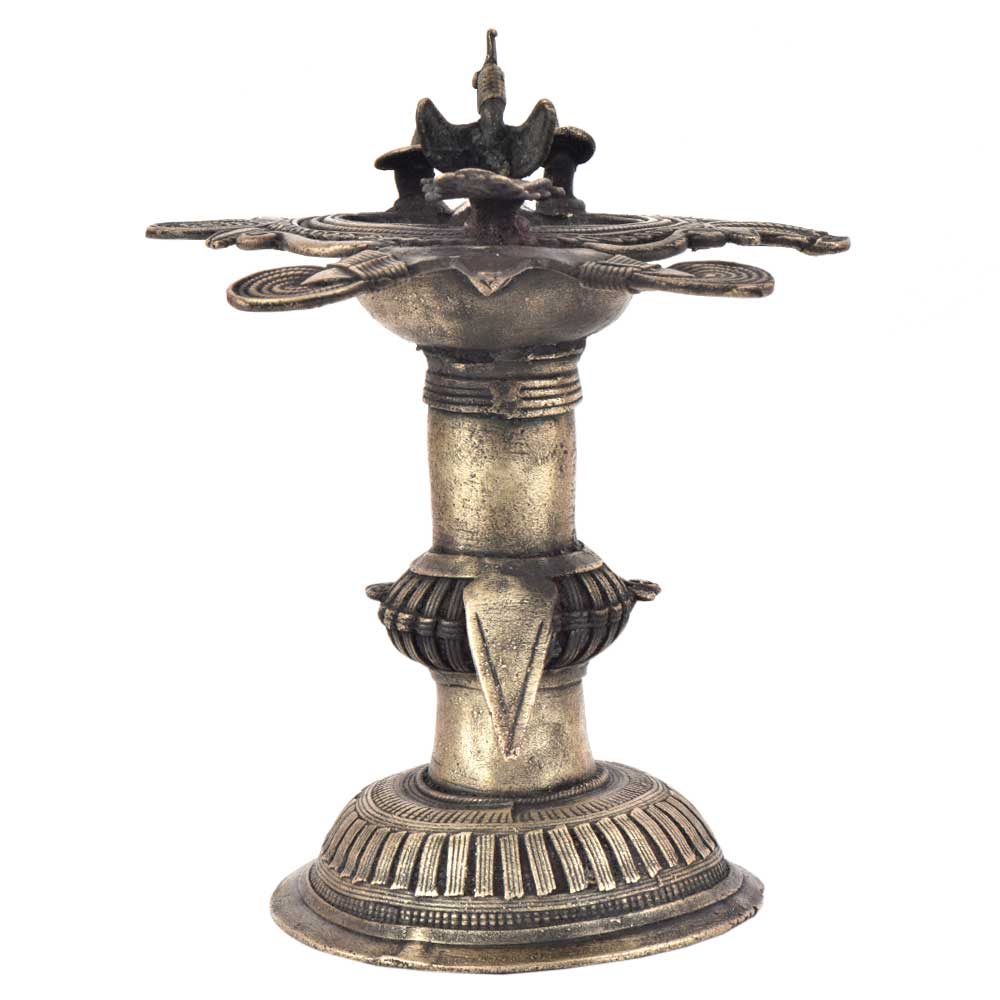 Handcrafted using old lost wax technique primarily practiced in Orrisa and West Bengals by the local or tribal artisans. In this technique the molten wax is poured into desired clay mould and when the wax melts the clay is broken and we get the desired metal object which is further polished to perfection. The Deep Cup Can Be Filled with Oil and Light a Cotton Wick. Diyas/ Oil Lamps are Considered Auspicious as in Hindu Religion. It is detailed with Elephant and Peacock Animals with Beautiful Details.