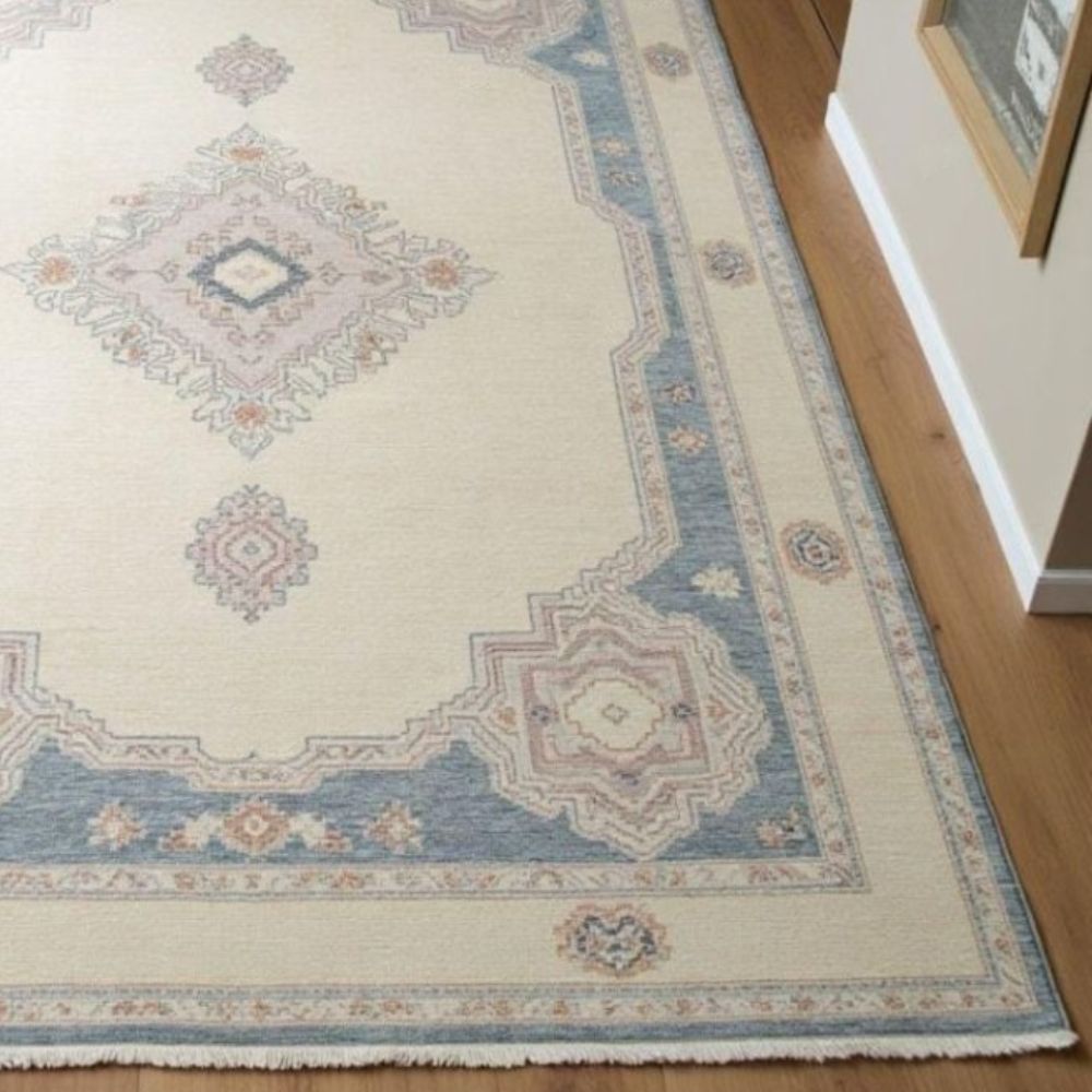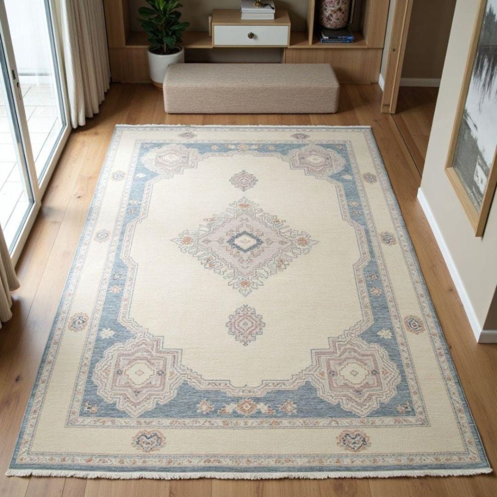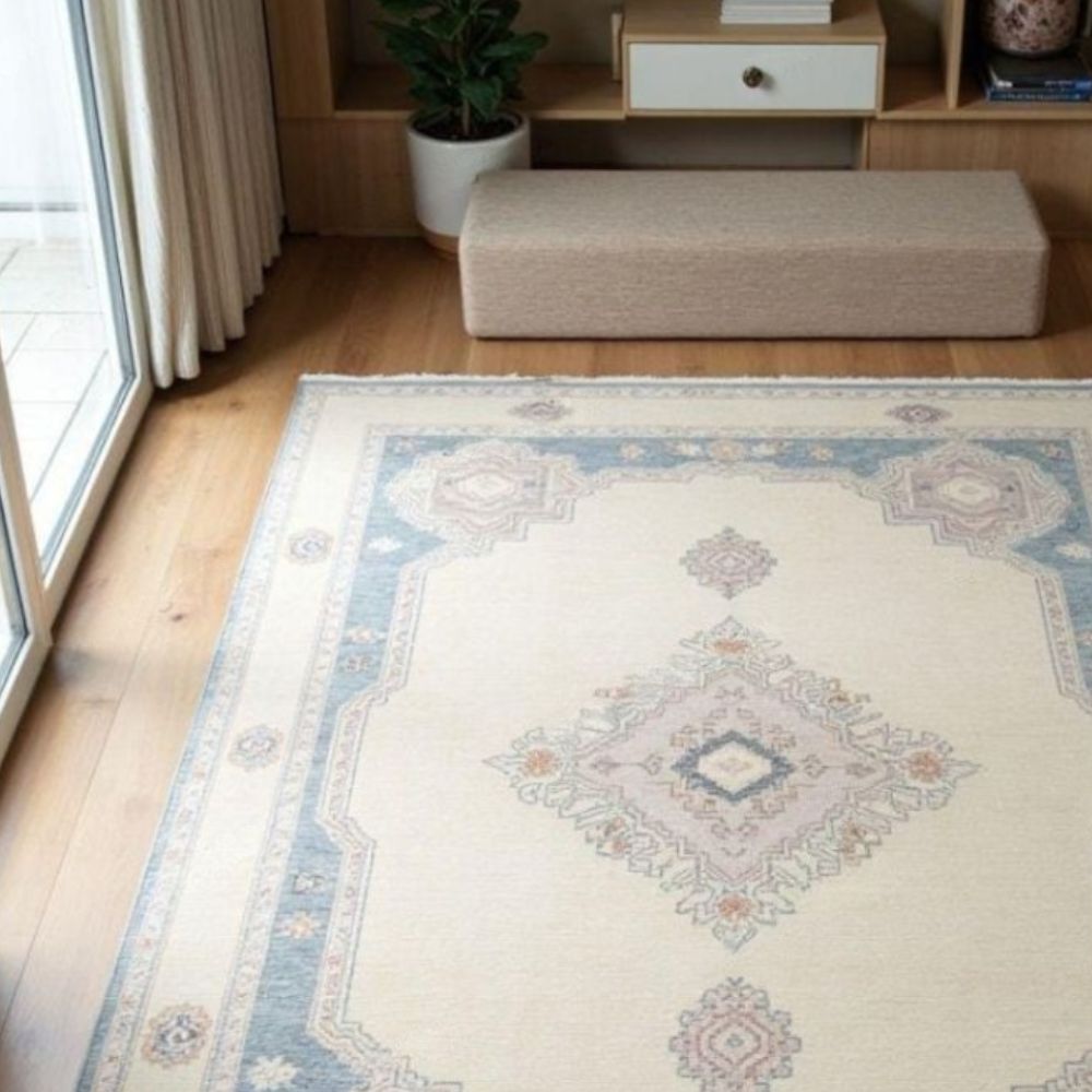 100% Hand-Knotted Wool Rug Crafted by skilled artisans using traditional Oushak weaving techniques for lasting quality. Elegant Cream Base with Soft Blue Accents Features a soothing central medallion and geometric borders that bring subtle charm to any space. Perfect for Luxury Interiors Ideal for living rooms, bedrooms, lounges, or villas seeking a touch of sophistication and warmth. Available in Multiple Sizes Custom sizes also available upon request to suit your unique space needs. Eco-Friendly & Durable Made with natural wool fibers that age gracefully and offer both softness and resilience. Product Description: Elevate your home dcor with the timeless charm of our Hand-Knotted Oushak Rug, masterfully crafted in traditional Turkish style. This piece features a calm cream base complemented by subtle sky blue borders and an intricate central medallion. The rug exudes a vintage aesthetic while remaining minimal and clean perfect for both modern and classic interiors. Each rug is made using natural wool and traditional knotting methods passed down through generations of skilled artisans. Its muted color palette and soft geometric patterns make it a harmonious addition to luxury.
