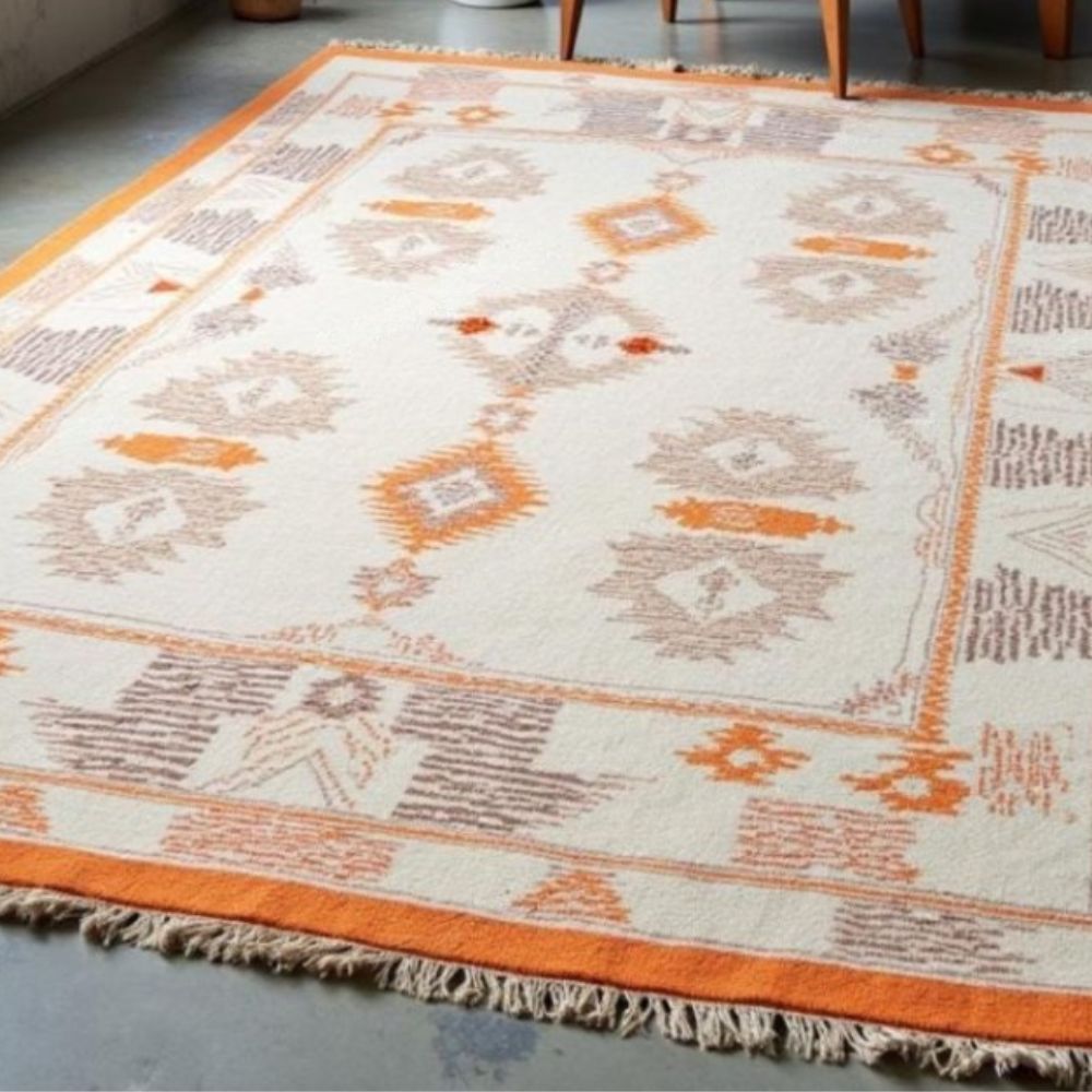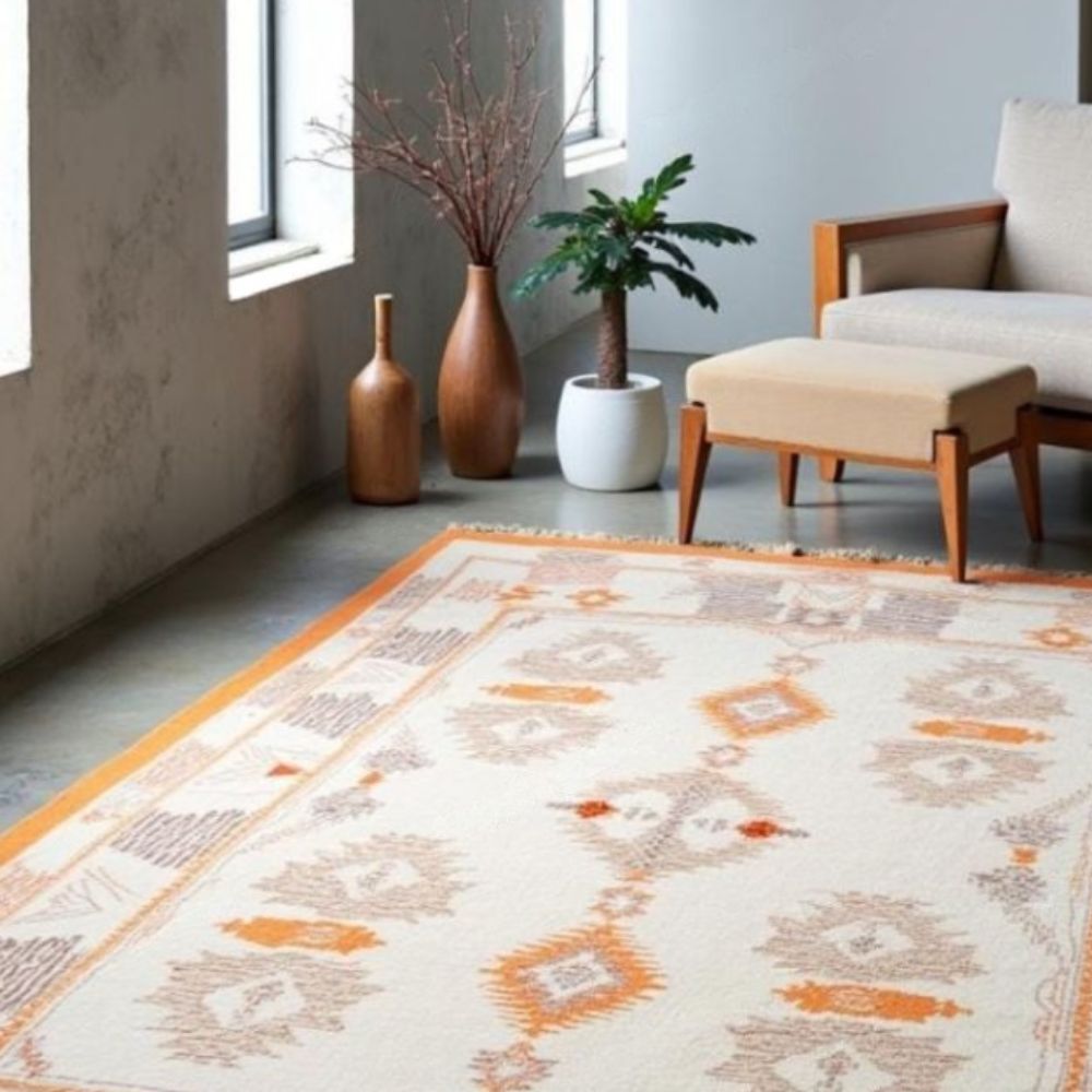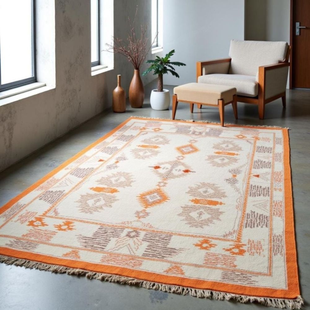 Featuring a contemporary tribal-inspired design in soft beige and vibrant orange, this piece blends modern minimalism with traditional weaving heritage. Meticulously hand-knotted by skilled artisans, this rug offers durability, comfort, and timeless beauty that will elevate your space for years to come. Its versatile palette works perfectly in living rooms, bedrooms, offices, or any cozy corner.