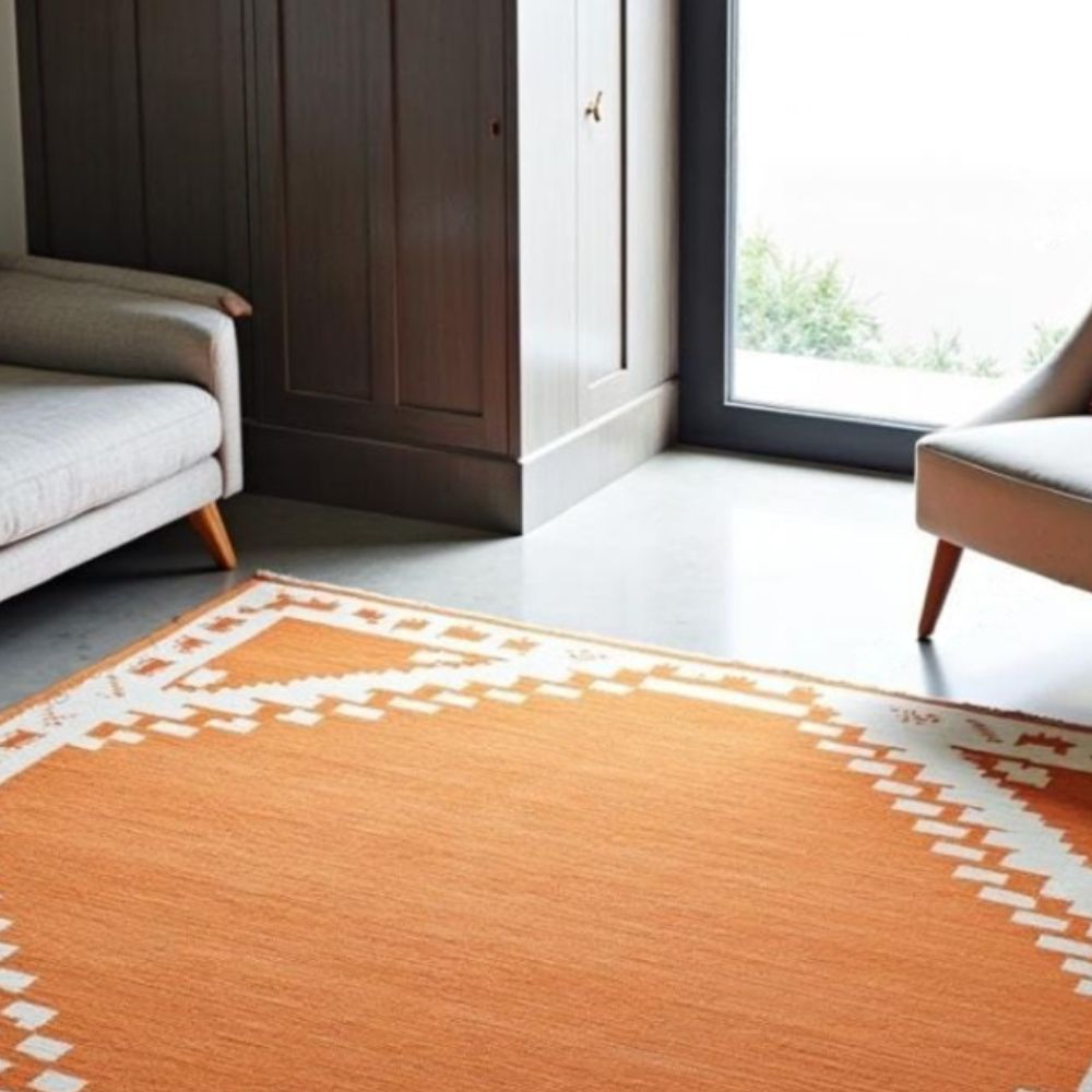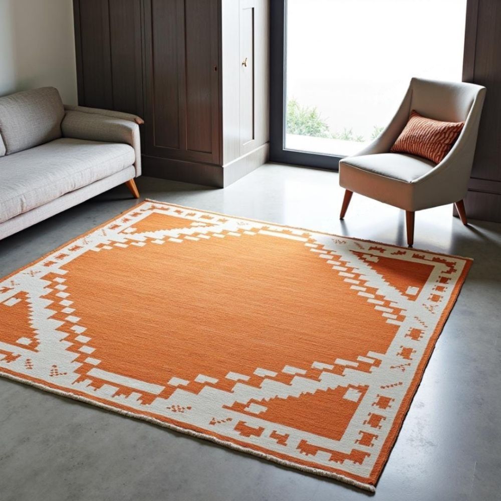Hand-Knotted Wool Area Rug Bold Minimalist Orange & Cream Geometric Pattern Modern Bohemian Living Room Carpet Description: Make a statement in your home with this striking hand-knotted wool rug featuring a bold, minimalist geometric pattern. Its vivid orange center framed with a crisp cream border creates a captivating contrast, perfect for adding warmth and character to contemporary or bohemian interiors. Crafted entirely by hand, each knot is tied with care by skilled artisans, ensuring a rug of exceptional quality and durability. The natural wool fibers offer both softness and resilience, making it as comfortable underfoot as it is beautiful to look at.