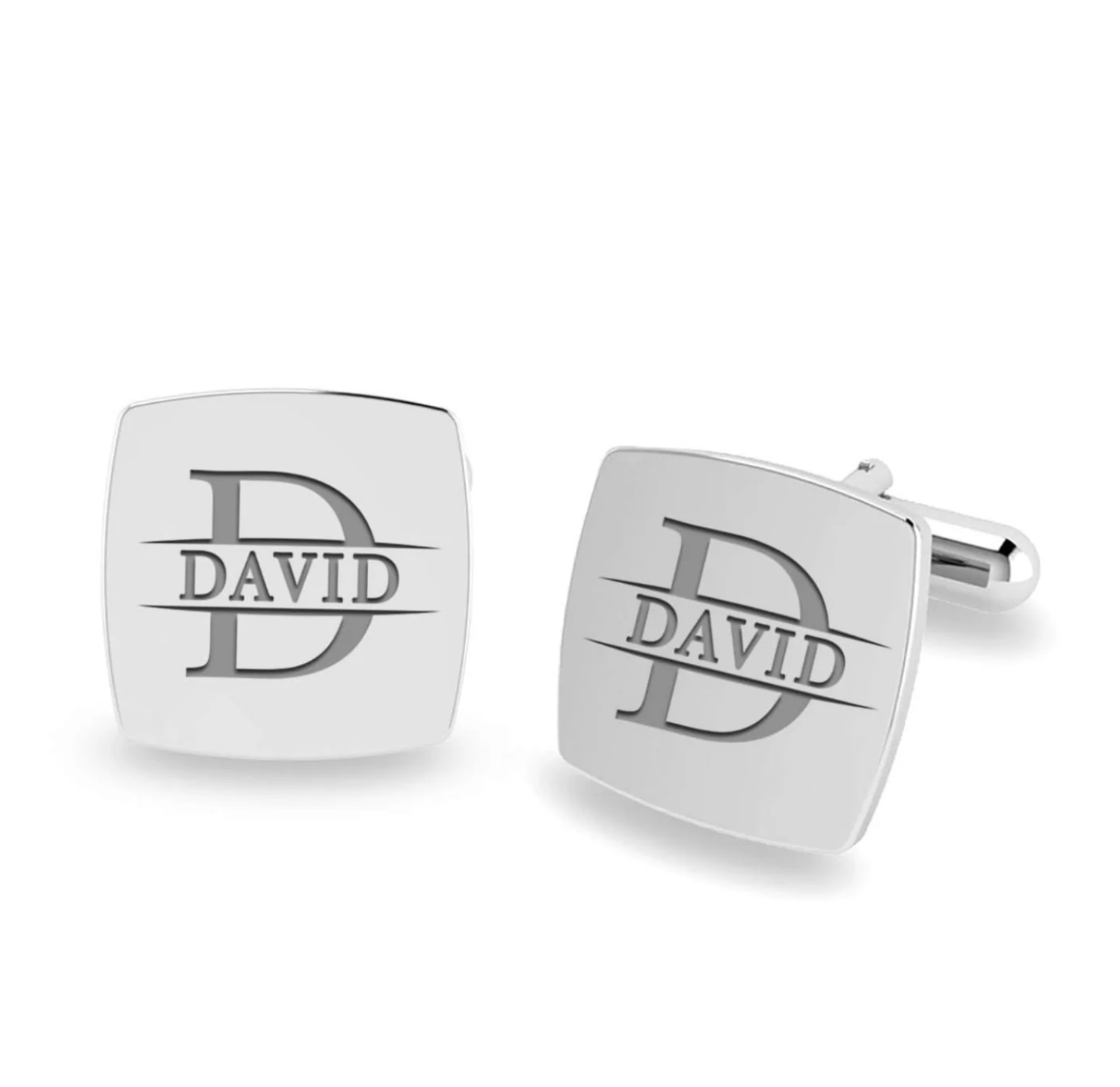 This sterling silver square cufflink set features the name David engraved with a bold initial design as seen in the jewellery. Crafted from premium 925 sterling silver, it offers a clean geometric surface with a polished finish that enhances its modern appeal. Designed for secure wear and refined styling, it adds a personalized edge to formal attire. Packed and quality checked by Indianshelf.
