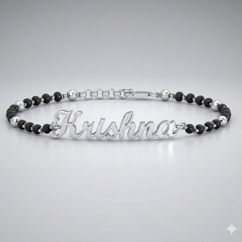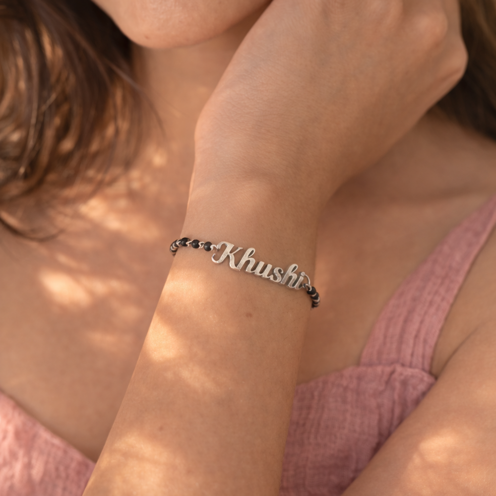 This sterling silver mangalsutra name bracelet features the name Khushi as shown in the jewellery design, blending tradition with personal identity. Crafted from premium 925 sterling silver, it is detailed with black bead accents that enhance its refined appearance. The lightweight structure ensures comfort for daily wear while maintaining elegance and meaning. Packed and quality checked by Indianshelf.
