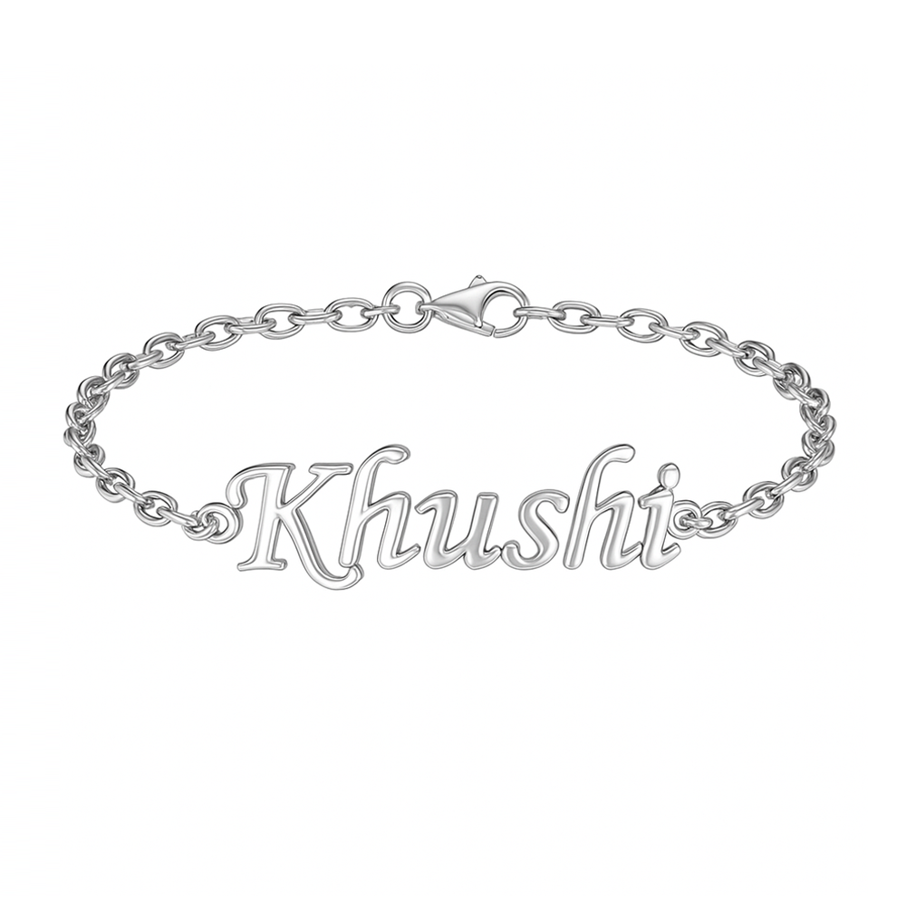 This sterling silver custom name bracelet blends refined design with personal meaning. Crafted from premium 925 silver, it features a Khushi name centerpiece shaped with precision and finished with a smooth polished surface. Its lightweight structure ensures comfort for everyday wear while adding a personalized touch to any outfit. Packed and quality checked by Indianshelf.