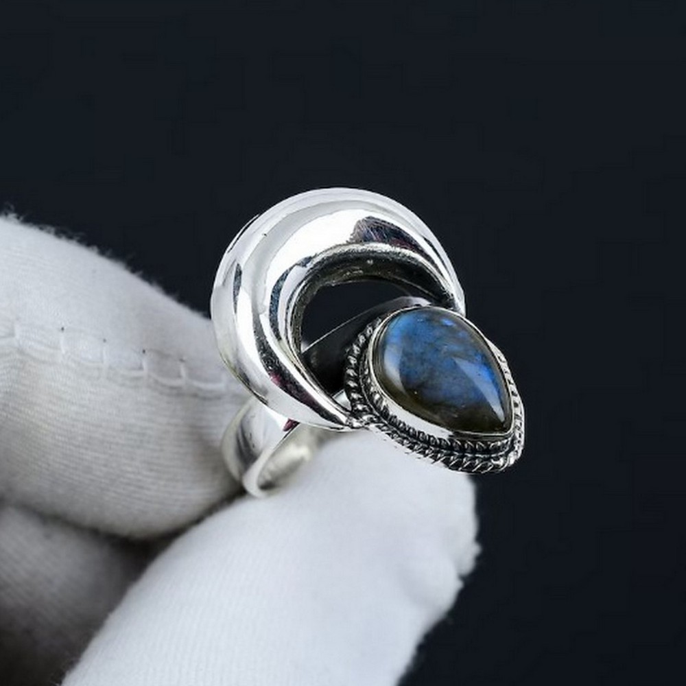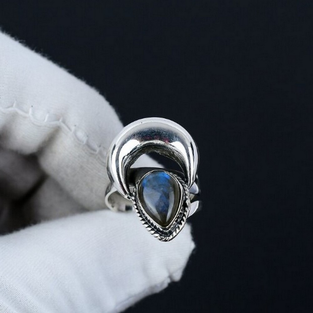 • Handmade 925 Sterling Silver Labradorite Ring Crescent Moon Design for Women
