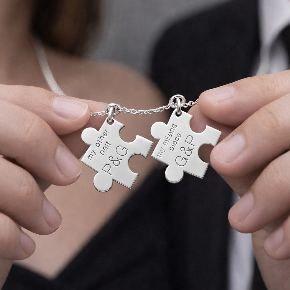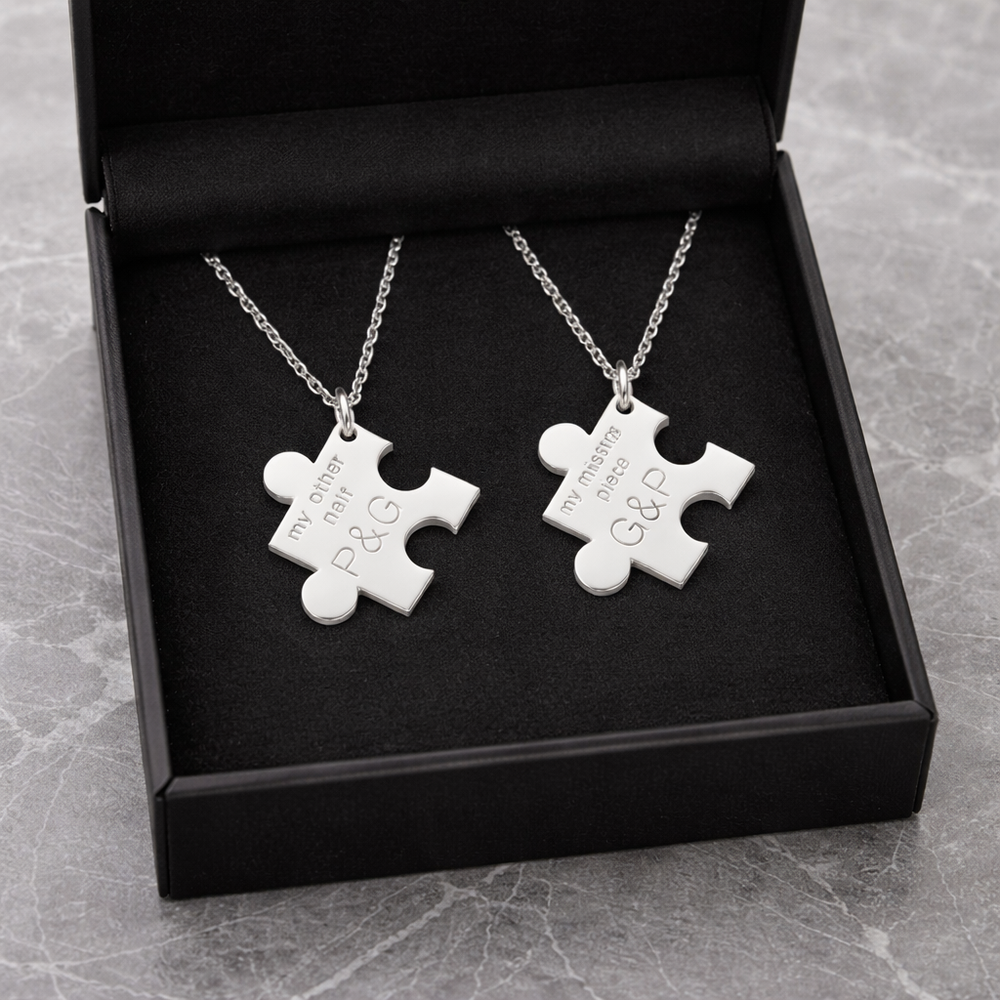 This sterling silver puzzle necklace set represents connection through two interlocking pendants as shown in the jewellery design. Crafted from premium 925 sterling silver, each piece carries engraved expressions with initials P and G that come together as a complete form. The polished finish and balanced structure make it meaningful for everyday wear. Packed and quality checked by Indianshelf.