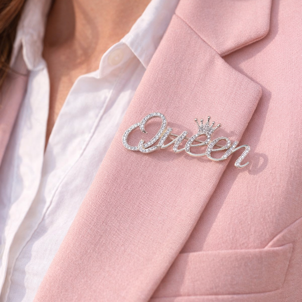 The Queen lettering paired with a crown motif creates a statement accessory that reflects confidence and individuality.