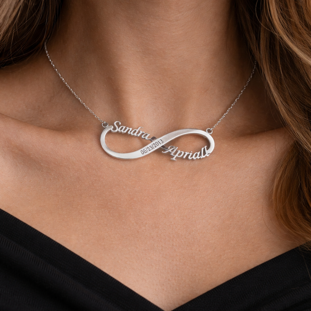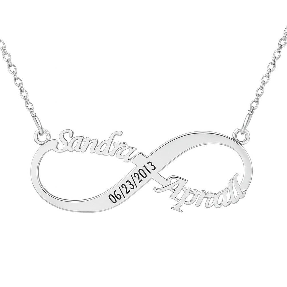 This sterling silver infinity name necklace features the names Sandra and Aprial as displayed in the jewellery design, connected within a continuous loop form. Crafted from premium 925 sterling silver, it also includes a central engraved date 06 23 2013 that enhances its personal significance. The clean structure and polished finish make it suitable for everyday wear. Packed and quality checked by Indianshelf.