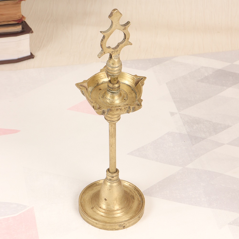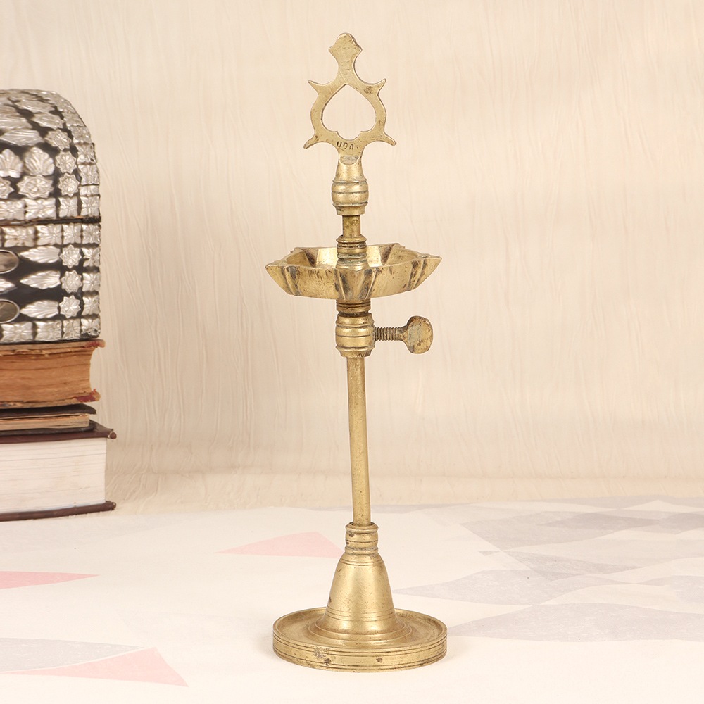 Elevate your space with the timeless allure of a vintage brass oil lamp. Infused with the rich heritage of South Indian art, this captivating lamp will transport you to a world of timeless elegance. Bring the enchantment of a bygone era into your home with this brass oil lamp. The soft, flickering light will infuse any space with a sense of tranquility and old-world charm. Whether placed on an end table, mantel, or windowsill, this lamp will elevate your décor while evoking the rich cultural traditions of South India. This lamp is perfect for those who appreciate fine craftsmanship and the beauty of natural materials. Its versatile design allows it to seamlessly blend into a variety of interior styles, from rustic to modern. Light the 5 jyots and enjoy the mesmerizing dance of the flames as you unwind after a long day or entertain guests with its warm, inviting glow.