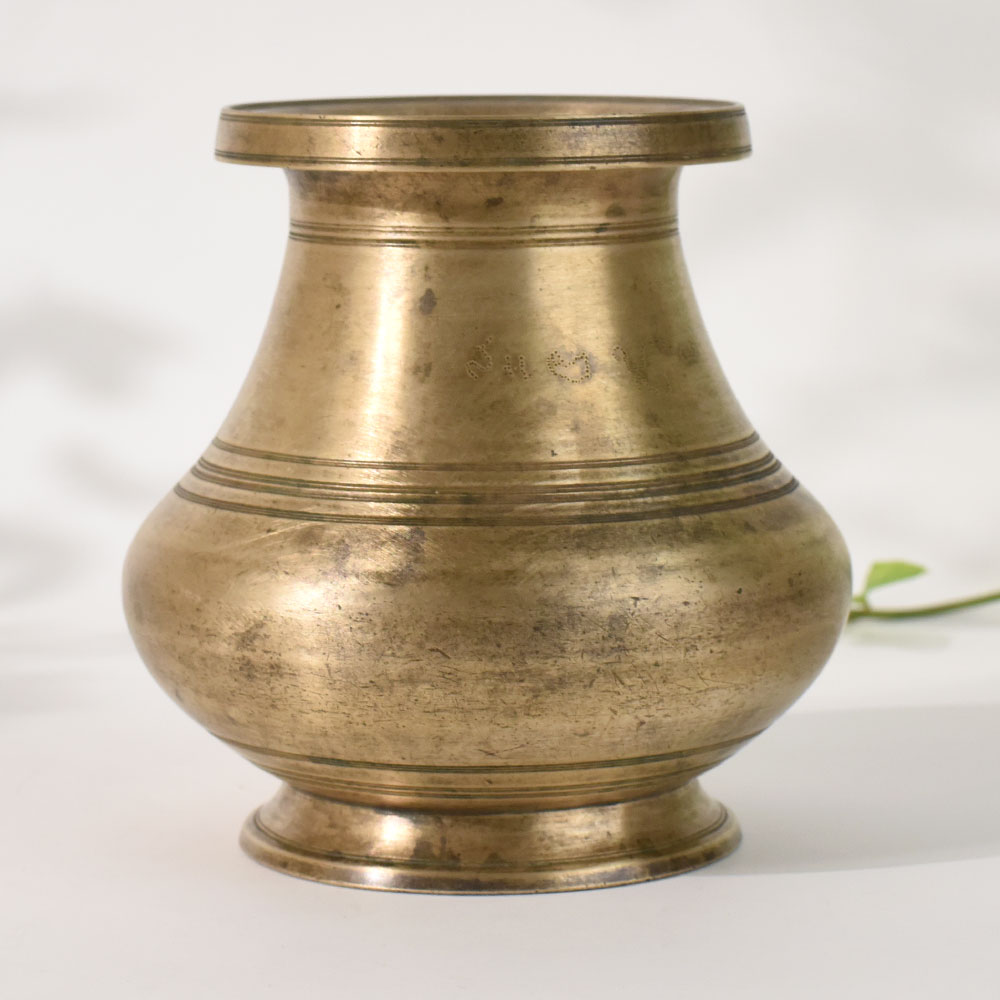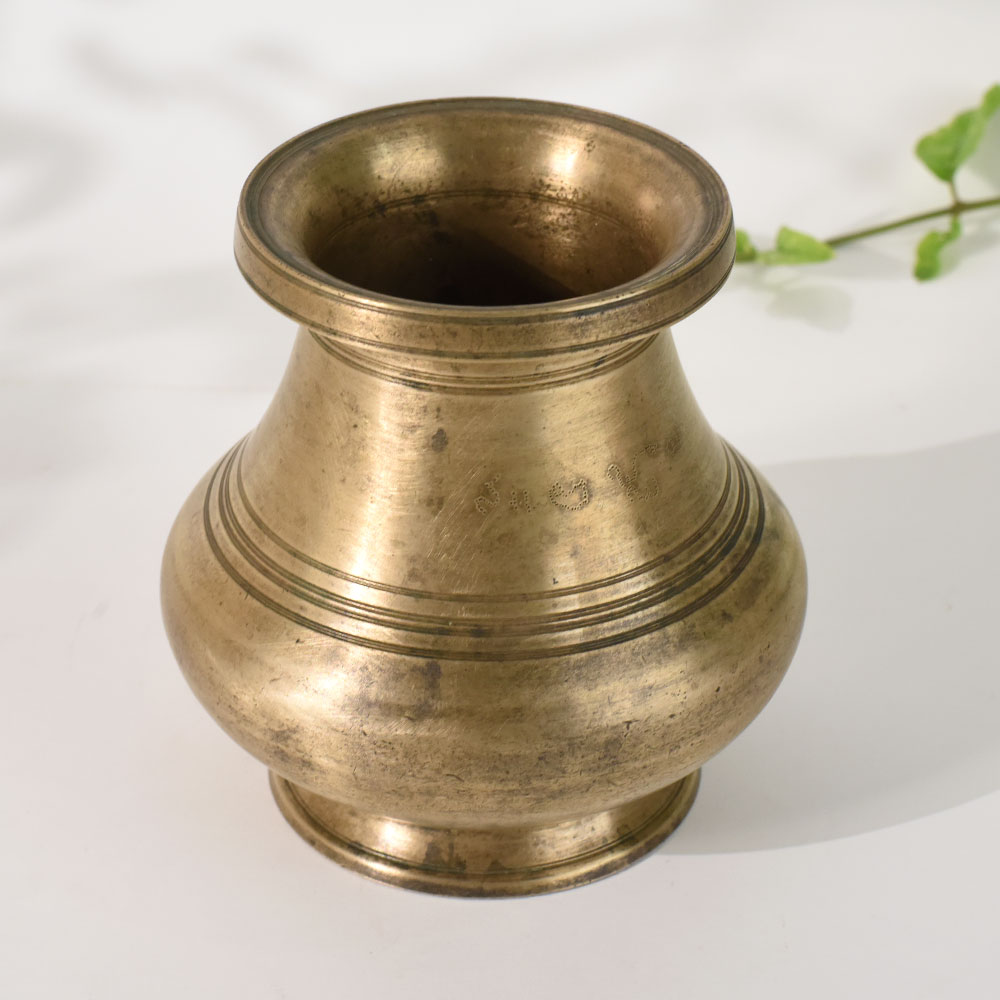 Celebrate the charm of traditional South Indian craftsmanship with this vintage brass holy water pot, a beautifully handmade vessel once used in daily rituals and sacred ceremonies. Its classic rounded form, flared rim, and engraved line details reflect the authentic design language of South Indian brassware. The naturally aged patina enhances its antique character, making it a meaningful collectible for lovers of heritage dcor. This brass pot, traditionally known as a lota or kalash, was used to store holy water during puja and household rituals. Its solid brass construction ensures durability while preserving its cultural essence. Perfect for spiritual spaces, home dcor styling, or vintage collections, this piece adds an aura of authenticity and history to any setting. Whether placed on a shelf, altar, or display corner, it instantly elevates the atmosphere with its warm, golden finish.