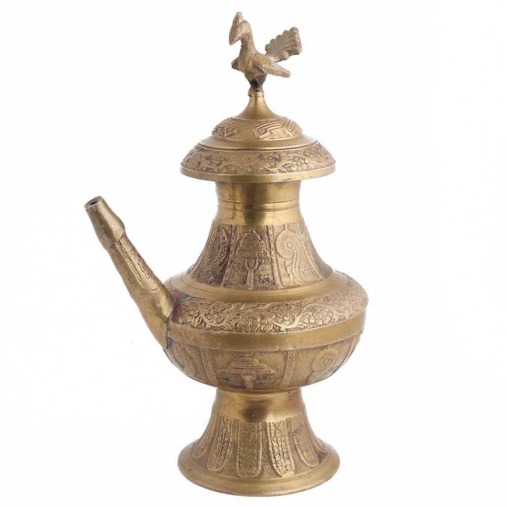 This old handmade brass surahi pot with a bird figurine on the Lid . This a perfect gift for weddings, housewarmings, anniversaries and festive occasions.