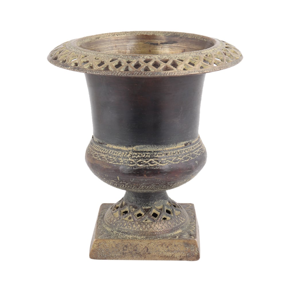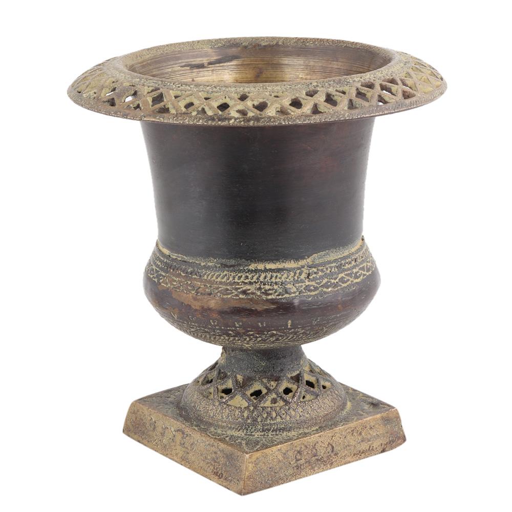 This traditional style brass urn shaped pot is designed by the master craftsmen and is perfect for your home or patio. It comes with a antique brown patina.