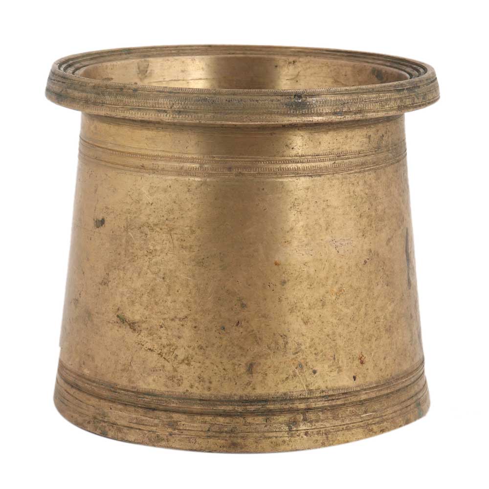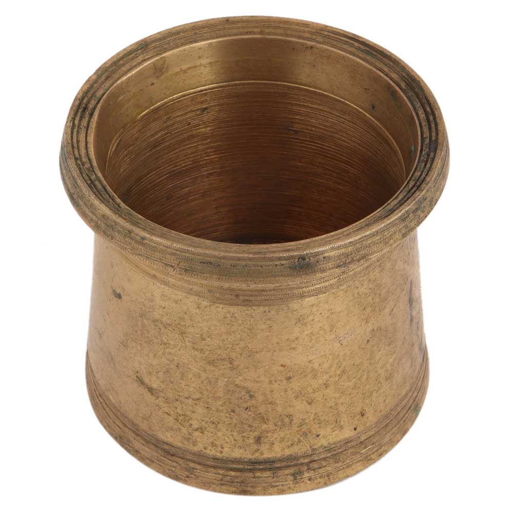 This old brass panchpatra cup can be placed in the puja room for worship or for wedding decoration, can be used as a pen pencil holder, a flower vase, or a votive cup.