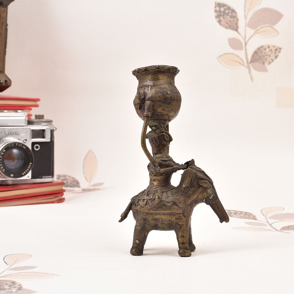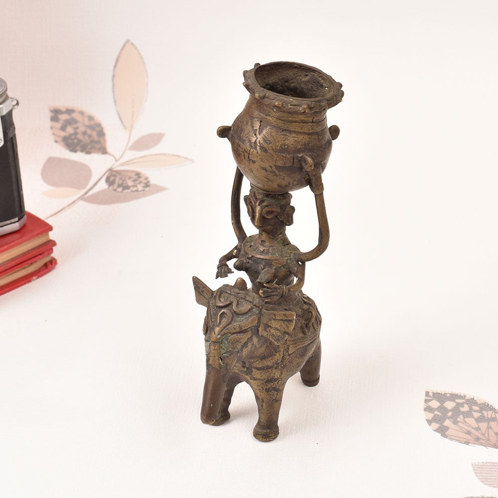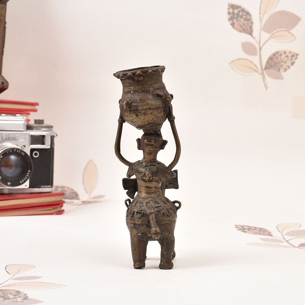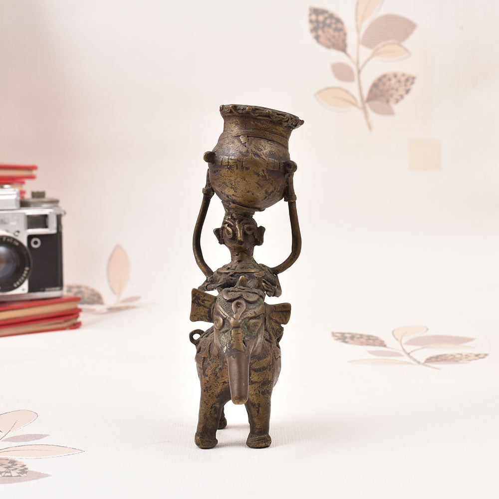 Prepare to be enchanted by the captivating vintage brass lady perched atop an elephant, gracefully balancing a pot upon her head. This stunning Bastar Art sculpture is a true work of art, infusing your space with a mesmerizing blend of tradition, elegance, and whimsical charm. Immerse yourself in the captivating world of Bastar Art with this exquisite brass sculpture. Crafted by skilled artisans, this piece celebrates the rich cultural heritage of the Bastar region, where age-old techniques and traditions are masterfully preserved. Display this enchanting work of art and let it transport you to a realm of timeless beauty and wonder. Whether you're adorning your living room, office, or any space that needs a touch of enchantment, this vintage brass lady atop an elephant is the perfect addition. Elevate your décor and inspire awe in all who behold this magnificent Bastar Art masterpiece.