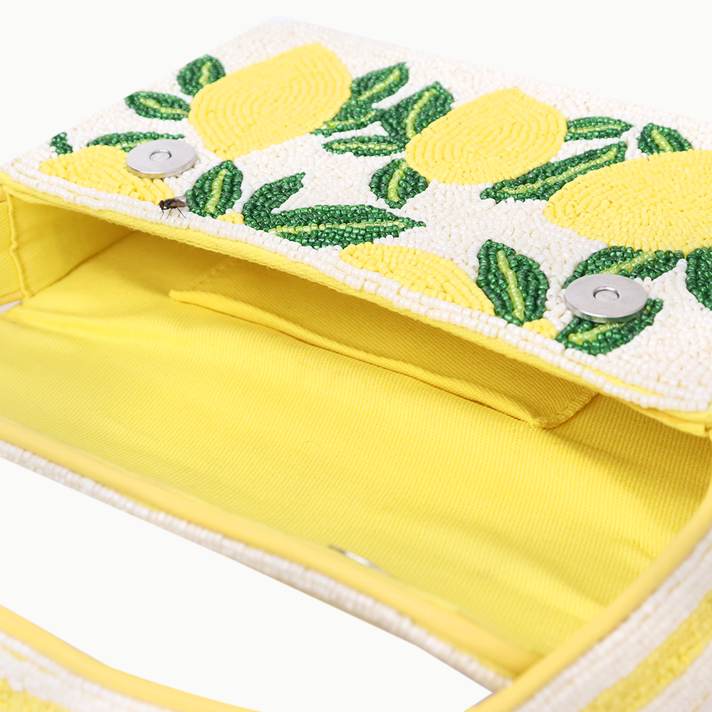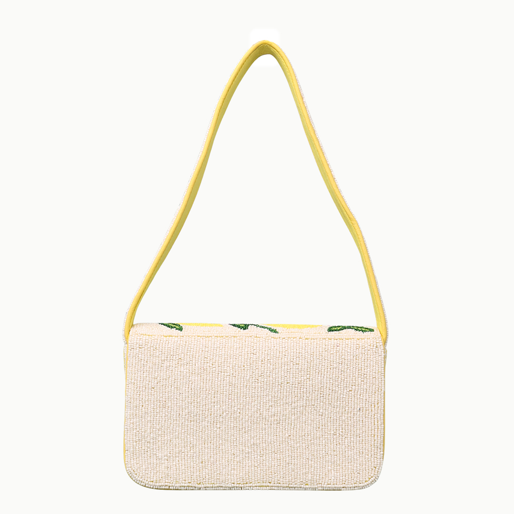 Bring a burst of sunshine to your wardrobe with this vibrant Lemon Beaded Shoulder Bag. Adorned with hand-embroidered yellow lemons, lush green leaves, and pops of pink floral detailing, this bag captures the spirit of summer in every stitch. The beadwork is set against a soft cream base with matching yellow strap lining, creating a refreshing and lively look. Perfect for vacations, brunches, or casual outings, it adds a cheerful statement to any outfit.