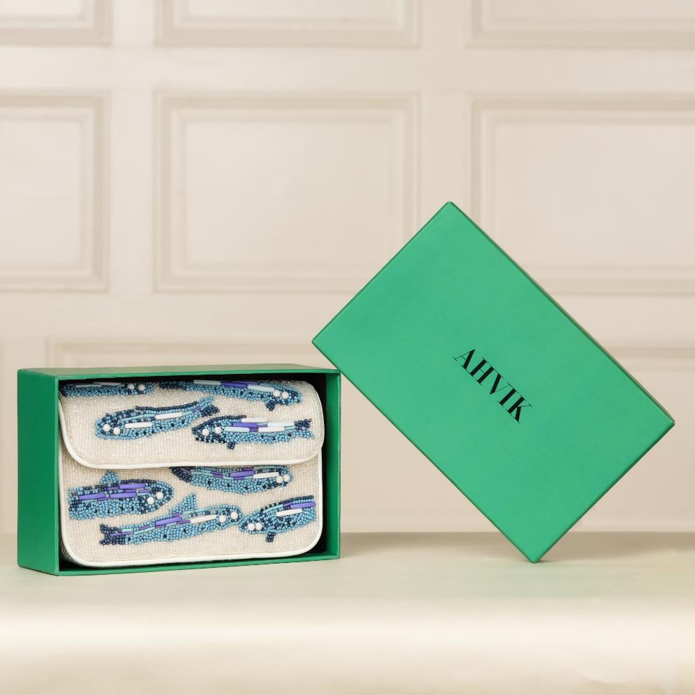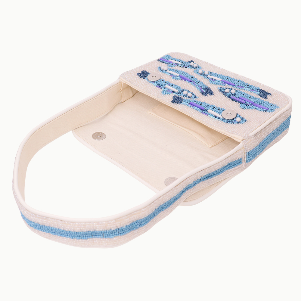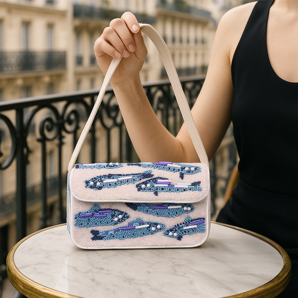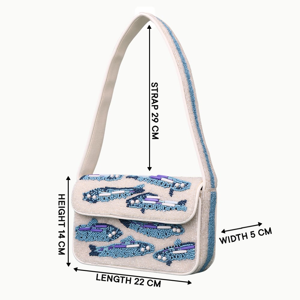 Bring a splash of ocean charm to your outfit with this beautifully handcrafted fish-themed beaded shoulder bag. Featuring intricate beadwork in shades of blue, purple, and white, the bag showcases swimming fish motifs on a pearl-beaded base. Its structured rectangular shape, spacious compartment, and comfortable shoulder strap make it both stylish and practical for daily use or special outings. Perfect for those who love unique, artisanal accessories.