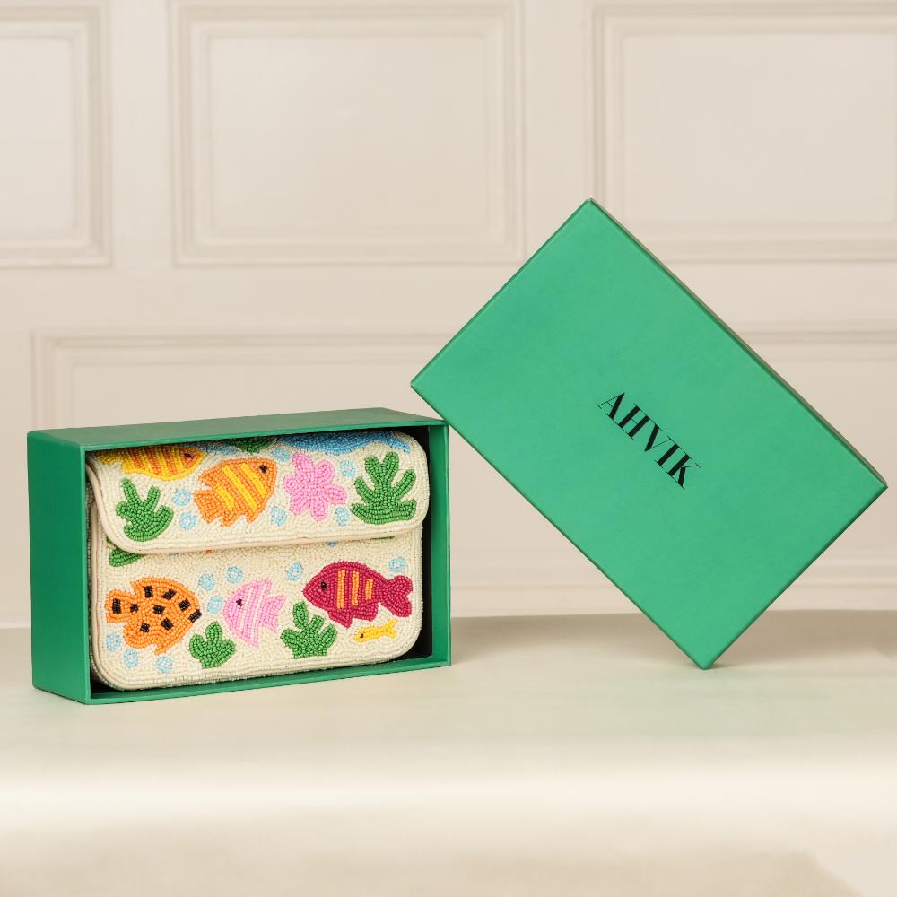 - Design: Hand-beaded fish and coral reef pattern with bright multicolor detailing