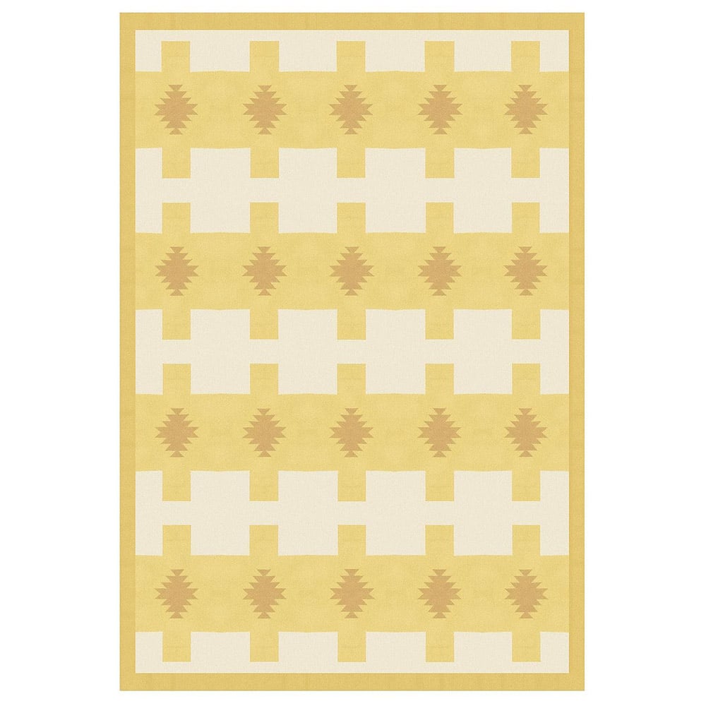 The pattern is distinctly minimalist, kilim, incorporating subtle tones of beige and yellow that add depth and character.