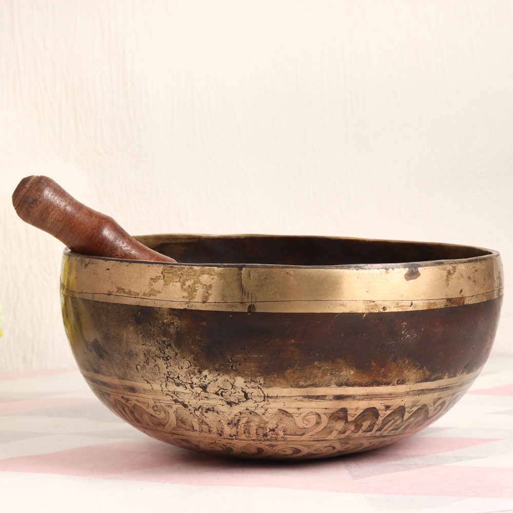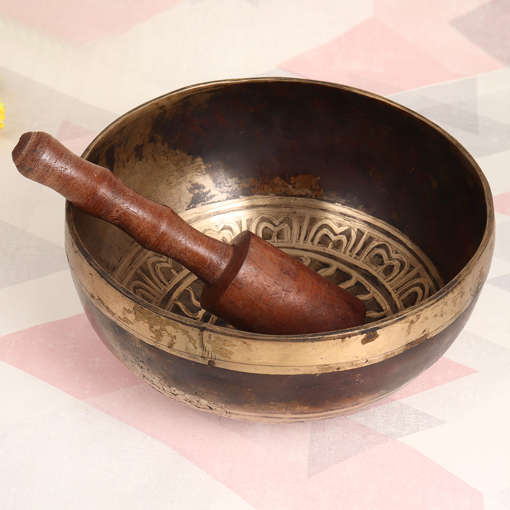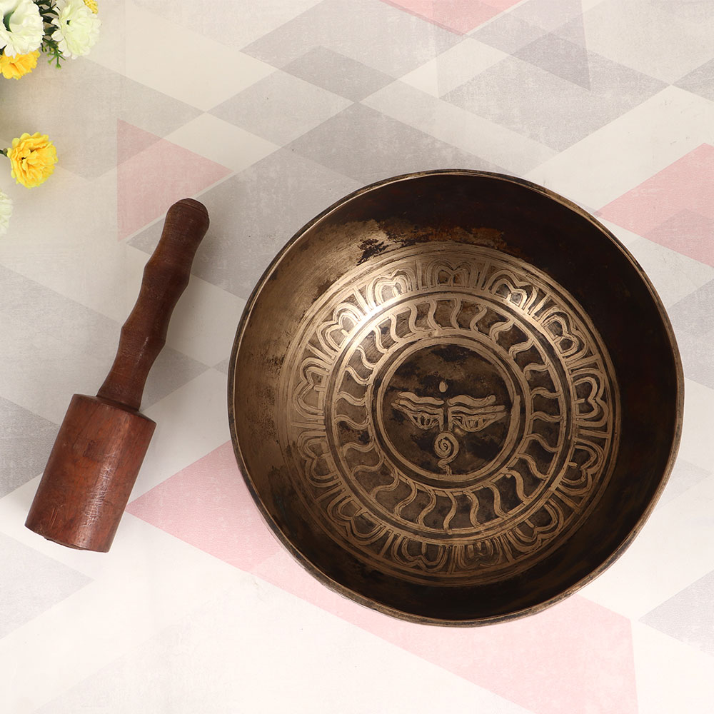 Buy a Vintage Bell Metal Om Singing Bowl online that is a magnificent piece of Tibetan artistry. Meticulously handcrafted by highly skilled artisans, this exquisite piece showcases the rich heritage of the Himalayan region. The bowl is cast from high-quality bell metal and features a captivating antique brown finish that exudes an aura of authenticity and nostalgia. Measuring both visually striking and sonically enchanting, this singing bowl comes with a complementary wooden mallet. Its deep, resonant tones are perfect for meditation, relaxation, and mindfulness practices, making it a valuable addition to your wellness rituals. Beyond its spiritual significance, the Vintage Bell Metal Om Singing Bowl serves as a captivating decor item suitable for home, office, restaurant, hotel, or shop interiors. This remarkable piece can enhance any space with its vintage appeal and unique cultural heritage. For collectors, this singing bowl is a rare find that adds depth and character to any vintage collection. Moreover, it makes for a thoughtful and auspicious gift for your loved ones on special occasions, festivals, or as a token of well-wishes during moments of significance.