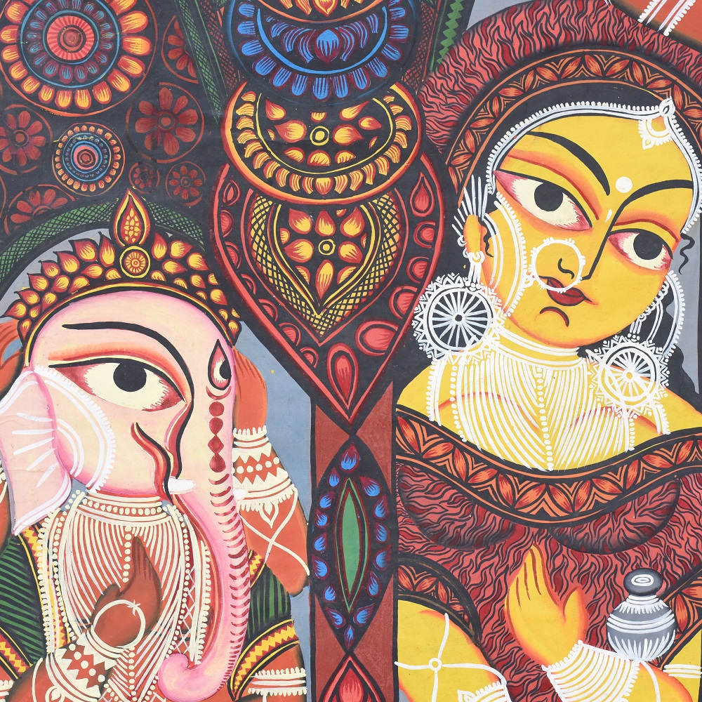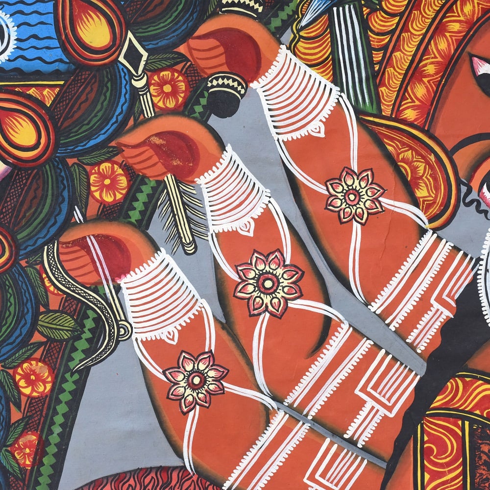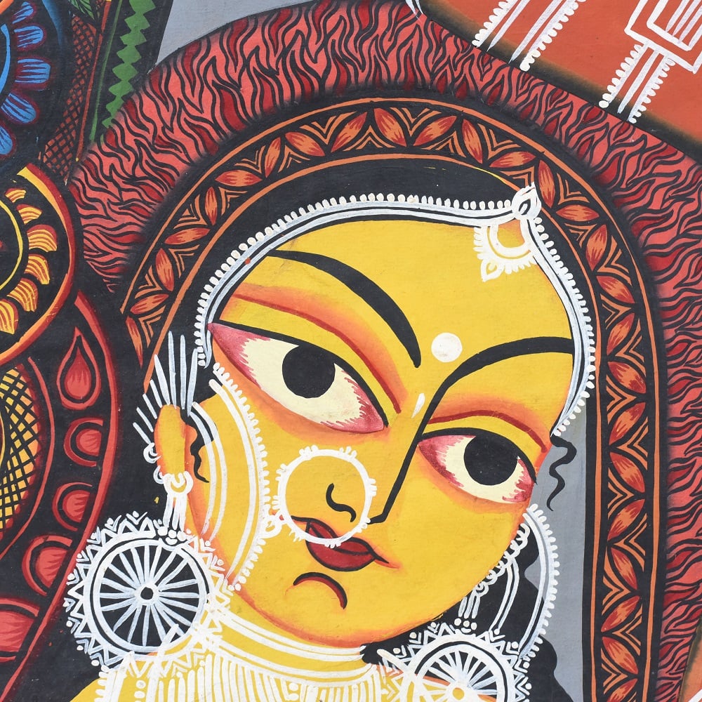 This handcrafted Kalighat painting is an authentic celebration of Bengal’s folk-art tradition, embodying both devotional symbolism and cultural heritage. At nearly 8 feet tall, the artwork becomes a commanding presence in any space, narrating stories of divine power, mythological grace, and everyday spirituality. With vivid reds, earthy greens, and bold outlines, the painting reflects the sacred aura of goddess Durga and her attendants, designed to inspire reverence while elevating interiors with timeless artistry. Each brushstroke honors the legacy of Indian artisans who keep this 19th-century painting tradition alive.