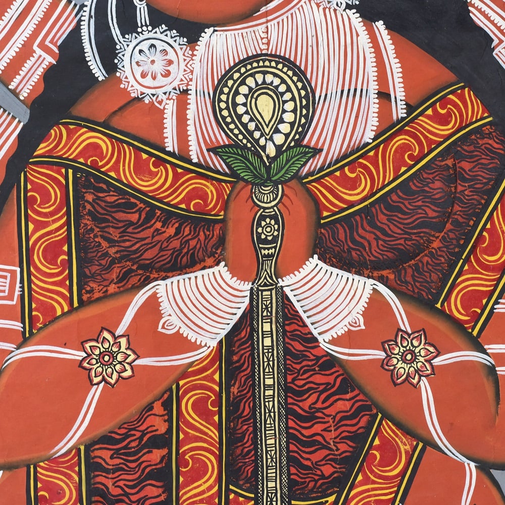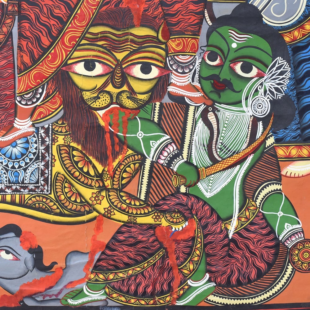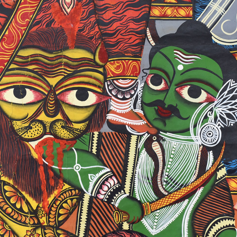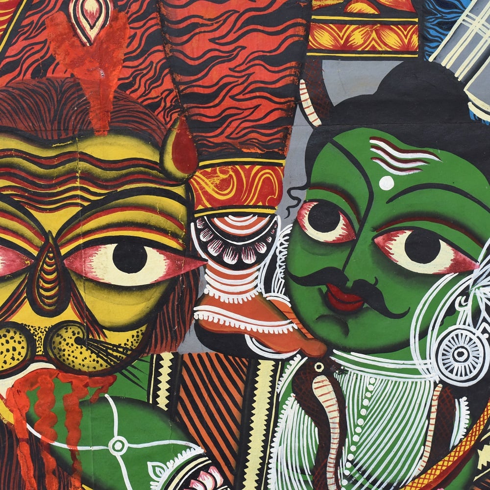 This handcrafted Kalighat painting is an authentic celebration of Bengal’s folk-art tradition, embodying both devotional symbolism and cultural heritage. At nearly 8 feet tall, the artwork becomes a commanding presence in any space, narrating stories of divine power, mythological grace, and everyday spirituality. With vivid reds, earthy greens, and bold outlines, the painting reflects the sacred aura of goddess Durga and her attendants, designed to inspire reverence while elevating interiors with timeless artistry. Each brushstroke honors the legacy of Indian artisans who keep this 19th-century painting tradition alive.