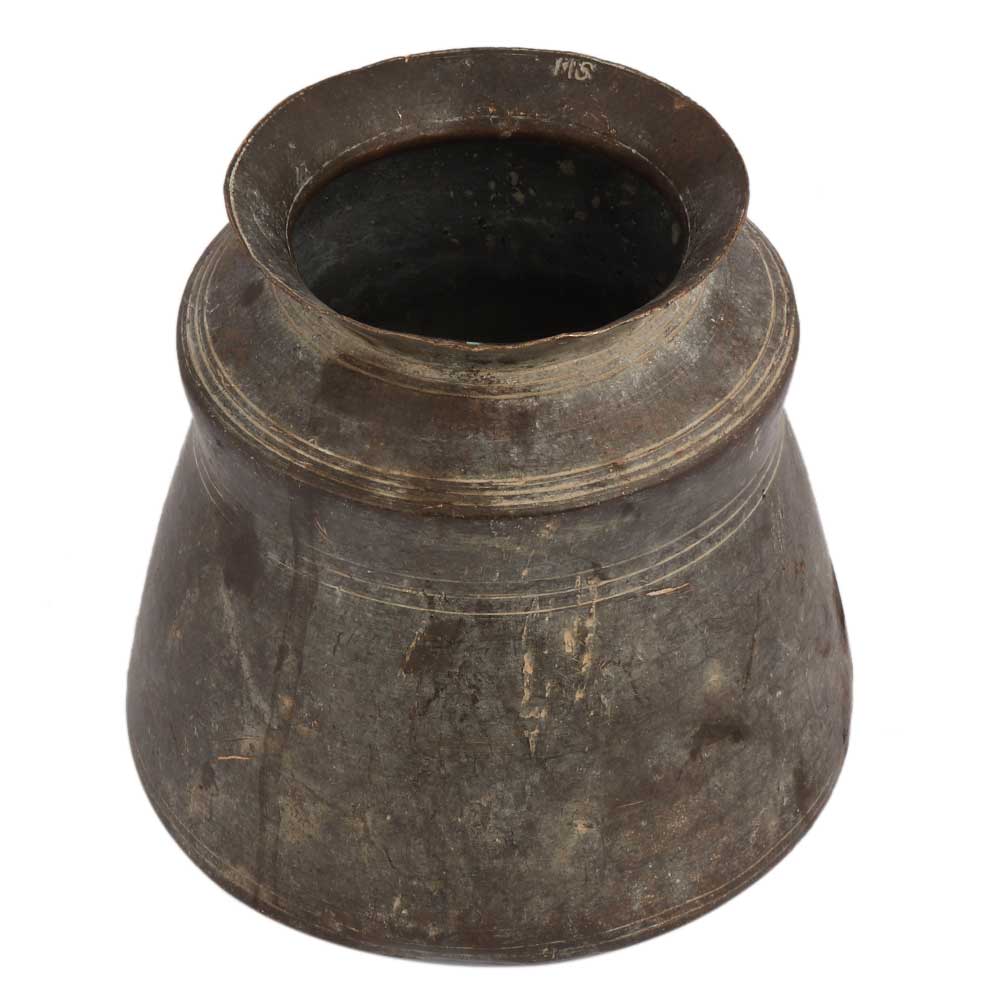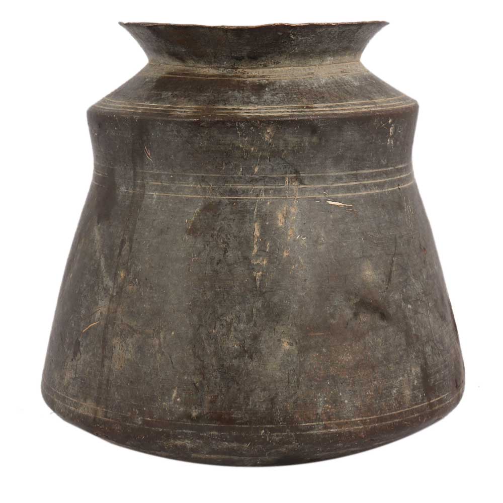 This is a rare original tribally constructed kitchen water storage pot fashioned of aged solid brass. It can be used as a flower pot, a coffee table centerpiece, or a present for friends and family.