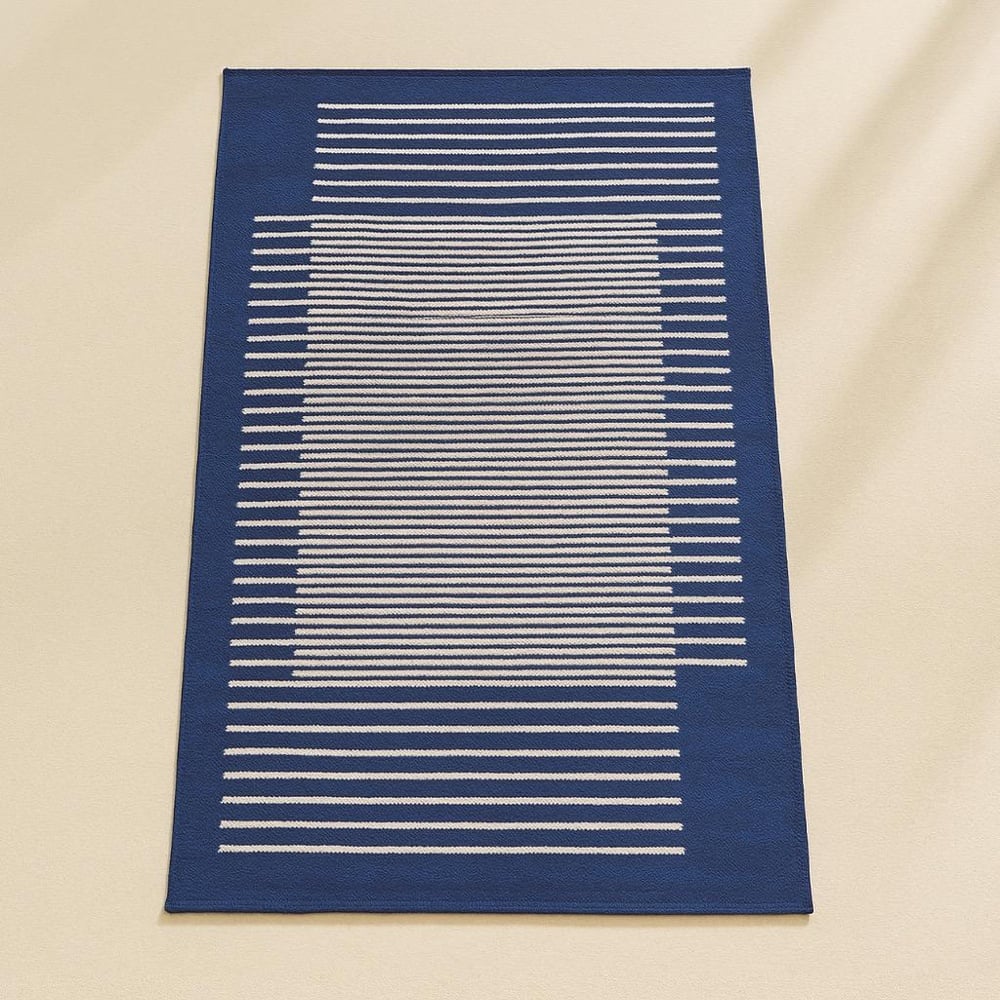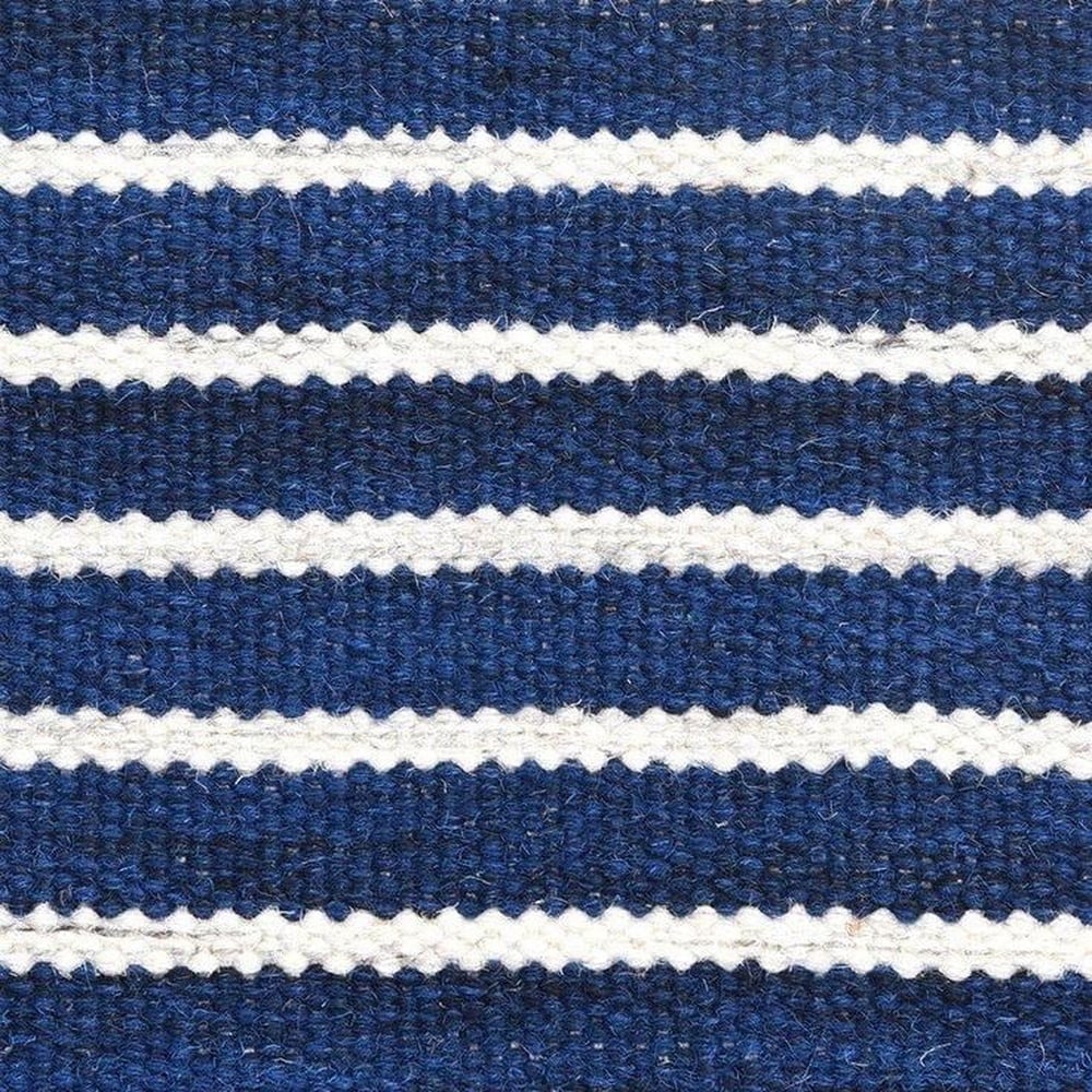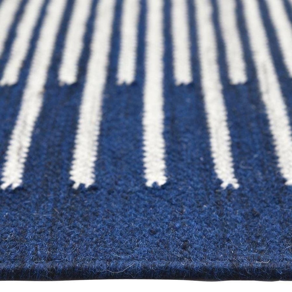 Bring refined charm to your home with this blue and white cotton dhurrie. Its modern, striped detailing captivates individuals looking for an extraordinary handcrafted piece for decor or gifting.