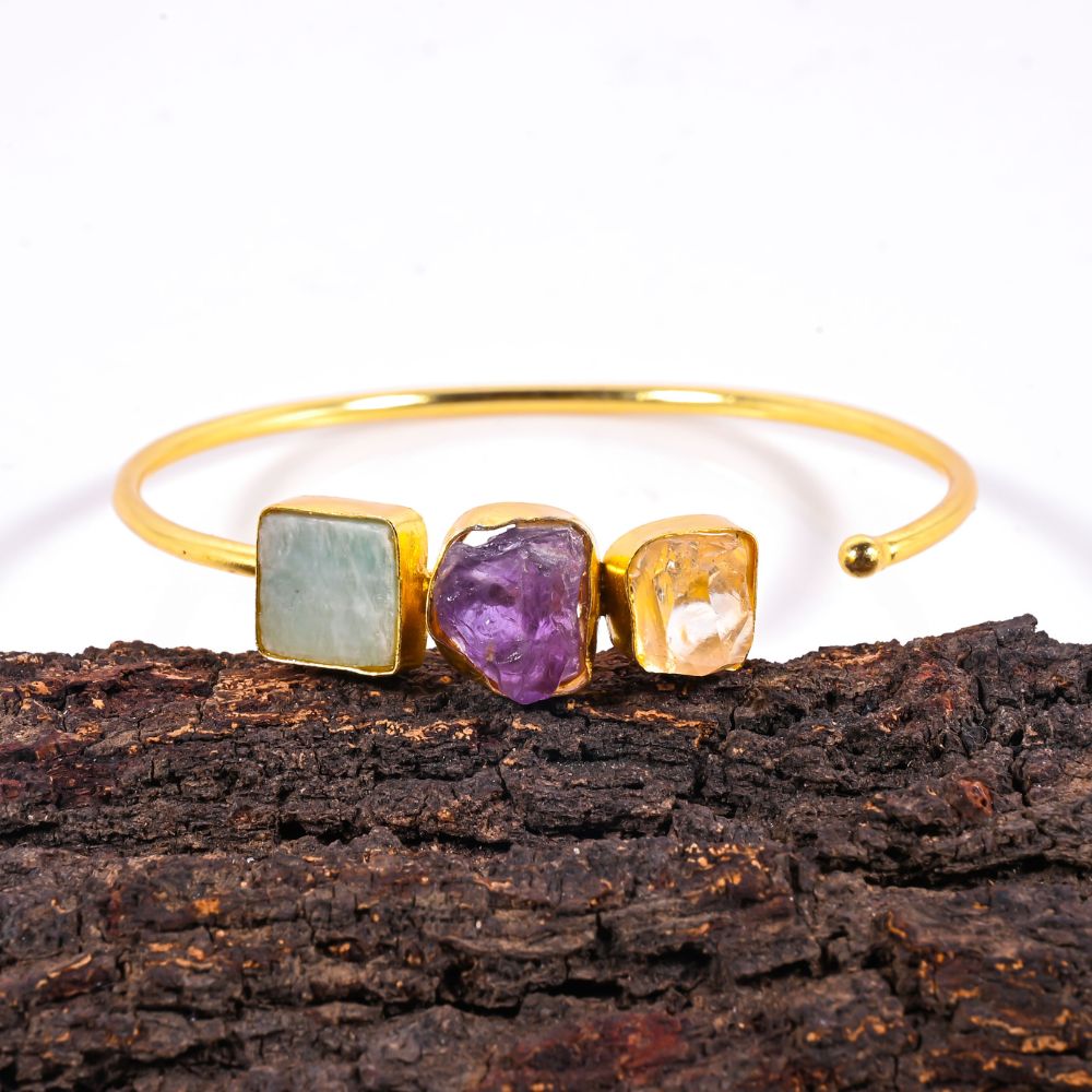 The Handmade Bracelet for Women with Raw Amazonite, Amethyst, and Citrine Gemstones is a celebration of natural energy and artisan craftsmanship. Crafted on a brass base and finished with luminous 22K gold plating, this bracelet features raw, uncut gemstones that retain their organic textures and colours. Each stone brings its own visual rhythm, creating a piece that feels earthy yet refined. Designed to sit comfortably on the wrist, it blends mindful beauty with everyday elegance.