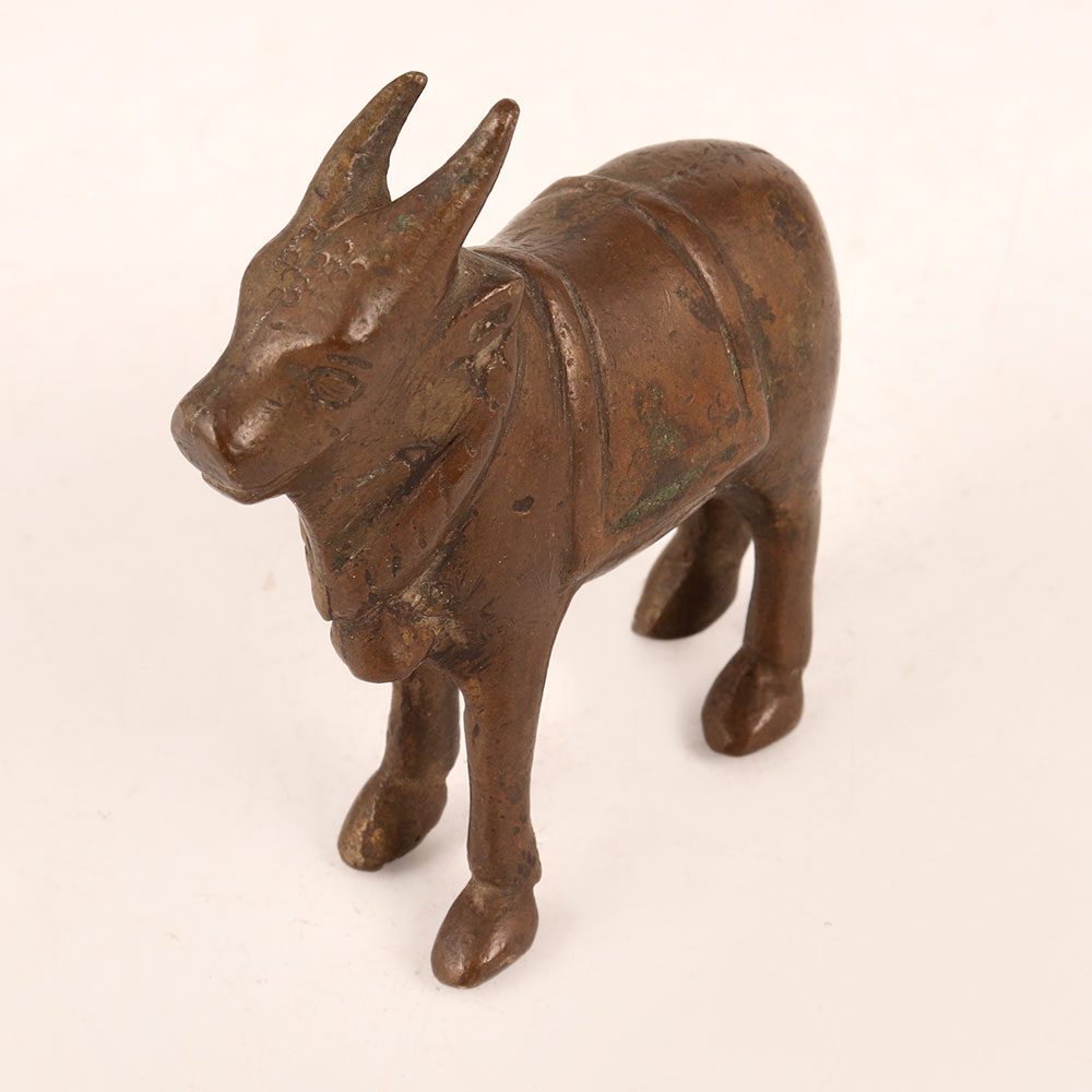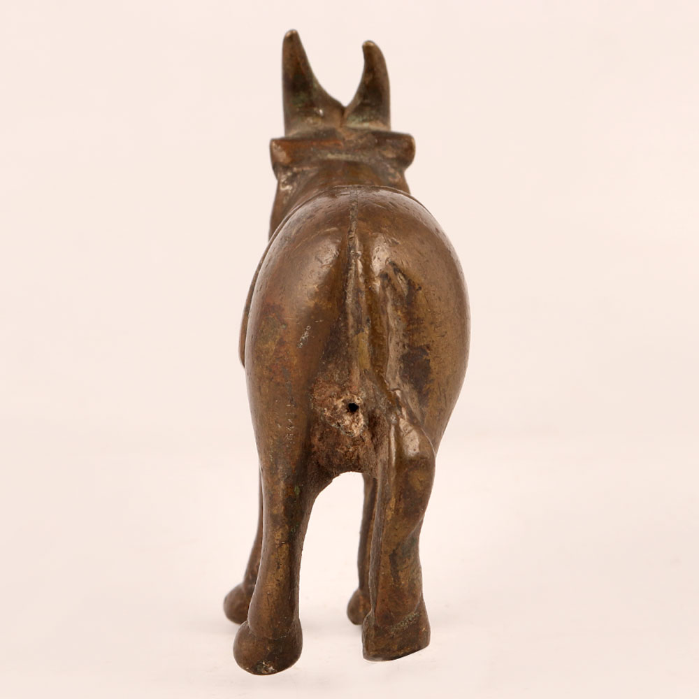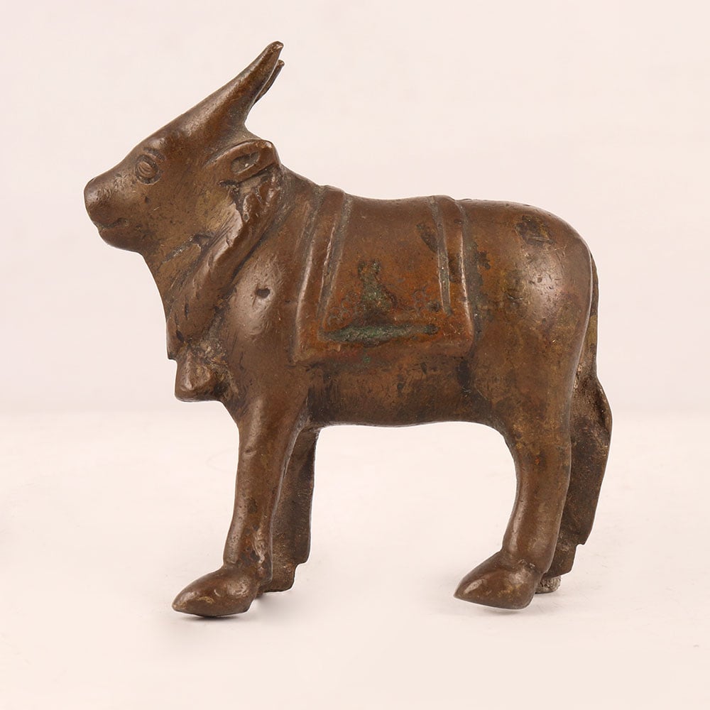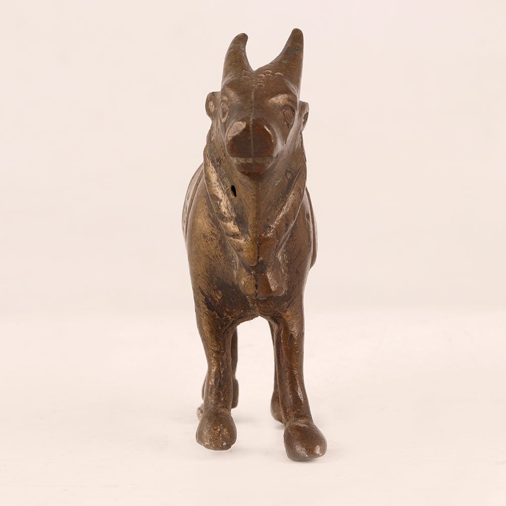 Capture the essence of devotion and craftsmanship with our exquisite small brass statue of standing Nandi, beautifully adorned in an antique brown finish. Nandi, the revered sacred bull and devotee of Lord Shiva, symbolizes loyalty, strength, and unwavering dedication. This meticulously handcrafted masterpiece by highly skilled Indian artisans from Himachal Pradesh carries a rich heritage of craftsmanship passed down through generations. Ideal for adorning various spaces, including homes, offices, restaurants, hotels, cafes, and shops, this statue is a perfect addition to prayer rooms, invoking an aura of serenity and spiritual connection. Its intricate details and antique brown finish evoke a sense of timeless beauty, making it equally suitable for decoration. A unique piece that holds cultural significance, this Nandi statue also appeals to collectors seeking to enrich their vintage collections. It serves as a thoughtful and cherished gift option for your loved ones on special, festive, or auspicious occasions, conveying both reverence and artistic elegance.