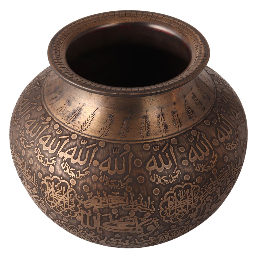 This brass cooking pot is hand carved from brass by skilled craftsmen in Islamic art. For centuries it was used for cooking rice and dal, as these are acid-free foods. It was also used as a water storage pot as brass vessels increase strength and immunity. You can use this pot for decoration in all places. Plant flowers and place it in the entrance, garden or indoor to enhance the look. It will give a vintage look to your home, restaurant or hotel.