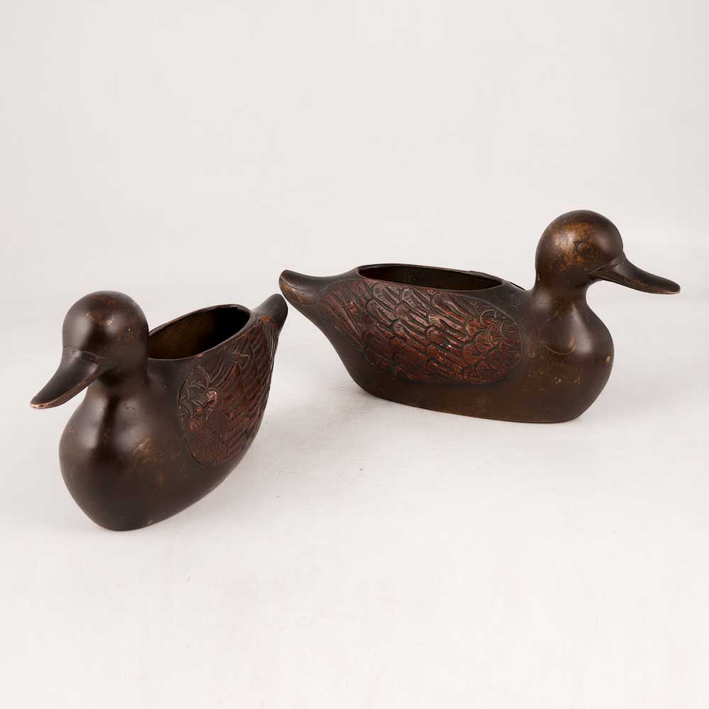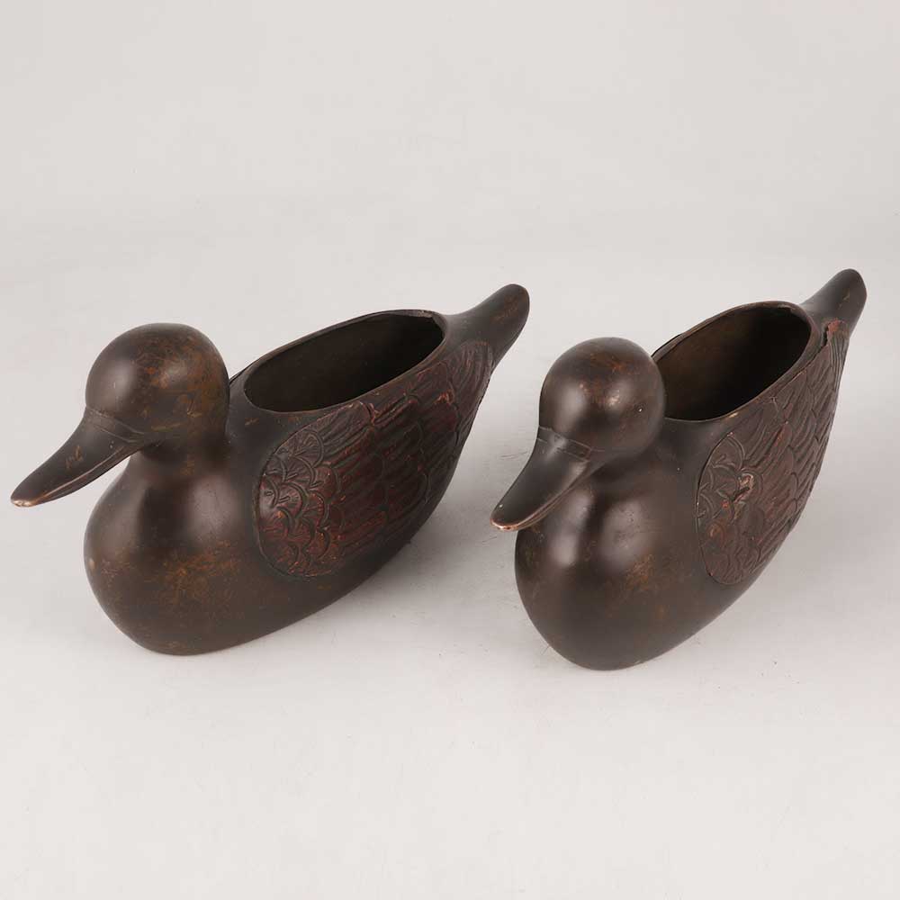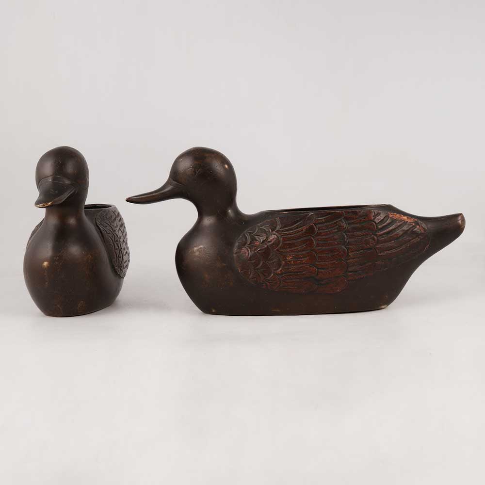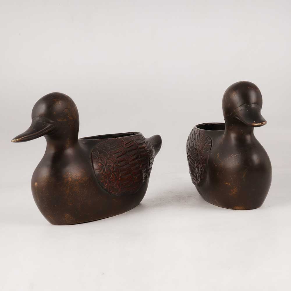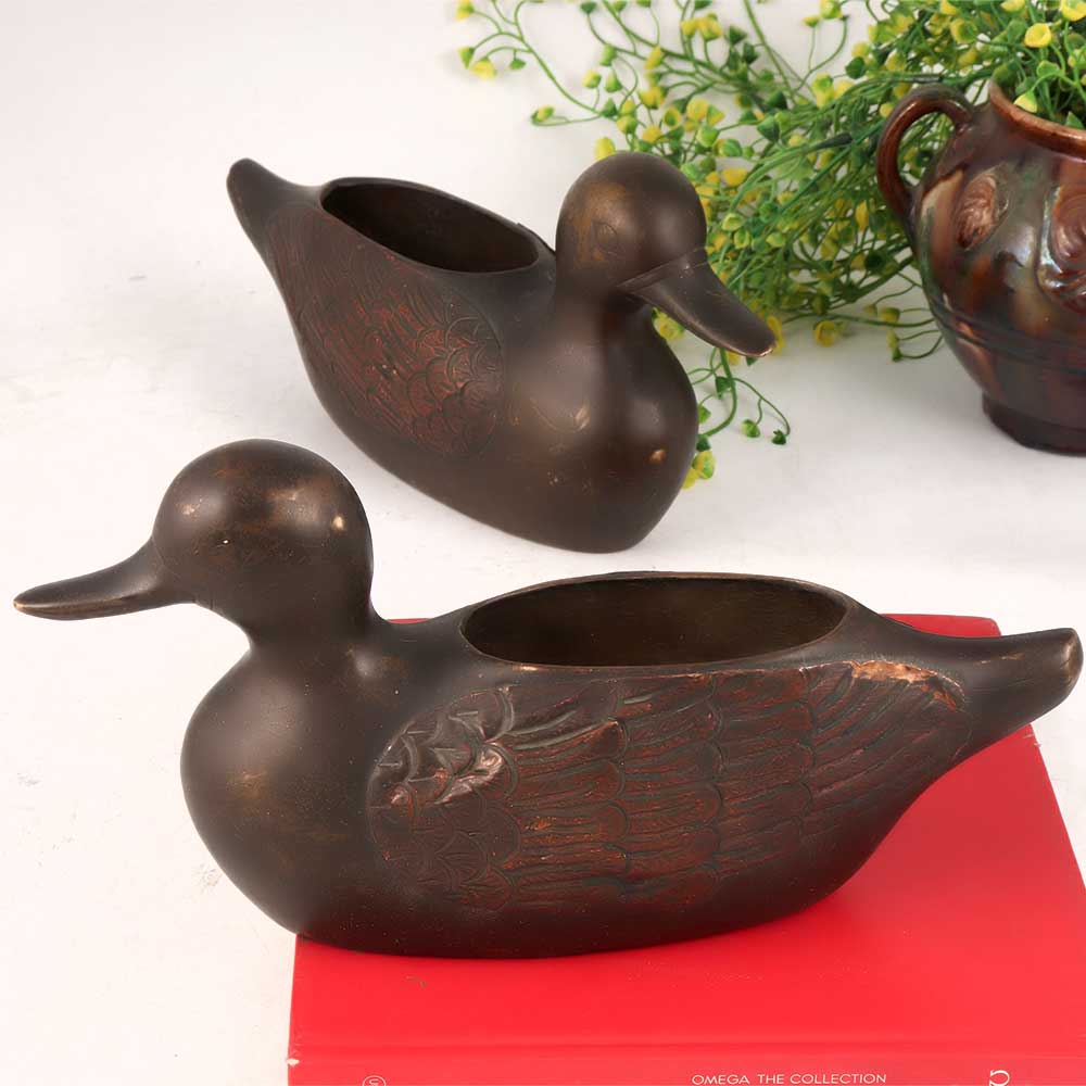 This Brass and Copper Duck Pair in Antique Brown Finish is a true work of art meticulously handcrafted by highly talented artisans. With a timeless appeal, these charming ducks will add a touch of sophistication to any space. Ideal for home, office, restaurant, hotel, or cafe decor, these ducks serve a dual purpose as both a flower pot and a pen stand, making them versatile and functional. Their elegant design and intricate detailing make them stand out as a perfect addition to any vintage collection, enhancing the overall aesthetics. Whether displayed at an exhibition or showcased as part of your interior decor, these ducks are sure to capture attention and admiration from onlookers. The warm Antique Brown Finish adds a vintage charm, accentuating their artistic allure. These Brass and Copper Ducks make for thoughtful gifts on special or festive occasions, symbolizing love, grace, and beauty. Surprise your loved ones with a gift that reflects both artistry and affection, making a lasting impression for years to come.