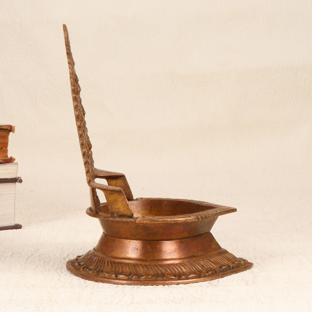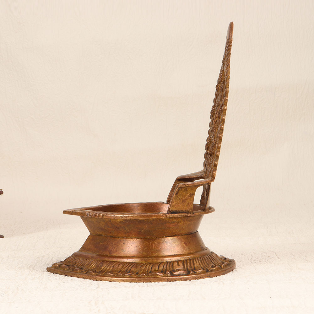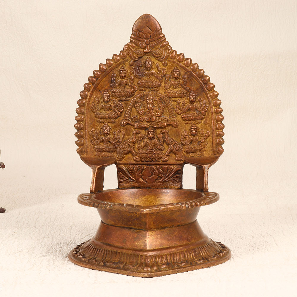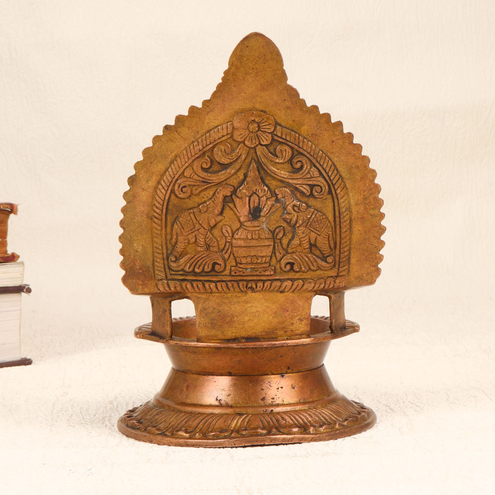Light Up Your Home with This Divine Vintage Brass Oil Lamp. This special lamp featuring the goddess Lakshmi will infuse your home with her blessings of prosperity and good fortune. Handmade in the traditional South Indian style, the solid brass lamp is adorned with detailed engravings and carvings depicting Lakshmi. The vintage finish gives the lamp a well-loved, aged look full of character. When lit, the oil lamp emanates a soothing, natural glow that creates a serene ambiance. The warm light reflects off the intricate brass work, accentuating the divine imagery of Lakshmi. Display this lamp prominently to invite Lakshmi's blessings into your home. An illuminating centerpiece is sure to inspire conversation. This vintage brass lamp is perfect for spiritually-minded decor. The lamp's divine imagery and natural light bring a peaceful, auspicious energy to any space. A meaningful gift for Hindu friends and family. Let the light of Lakshmi shine upon your home!