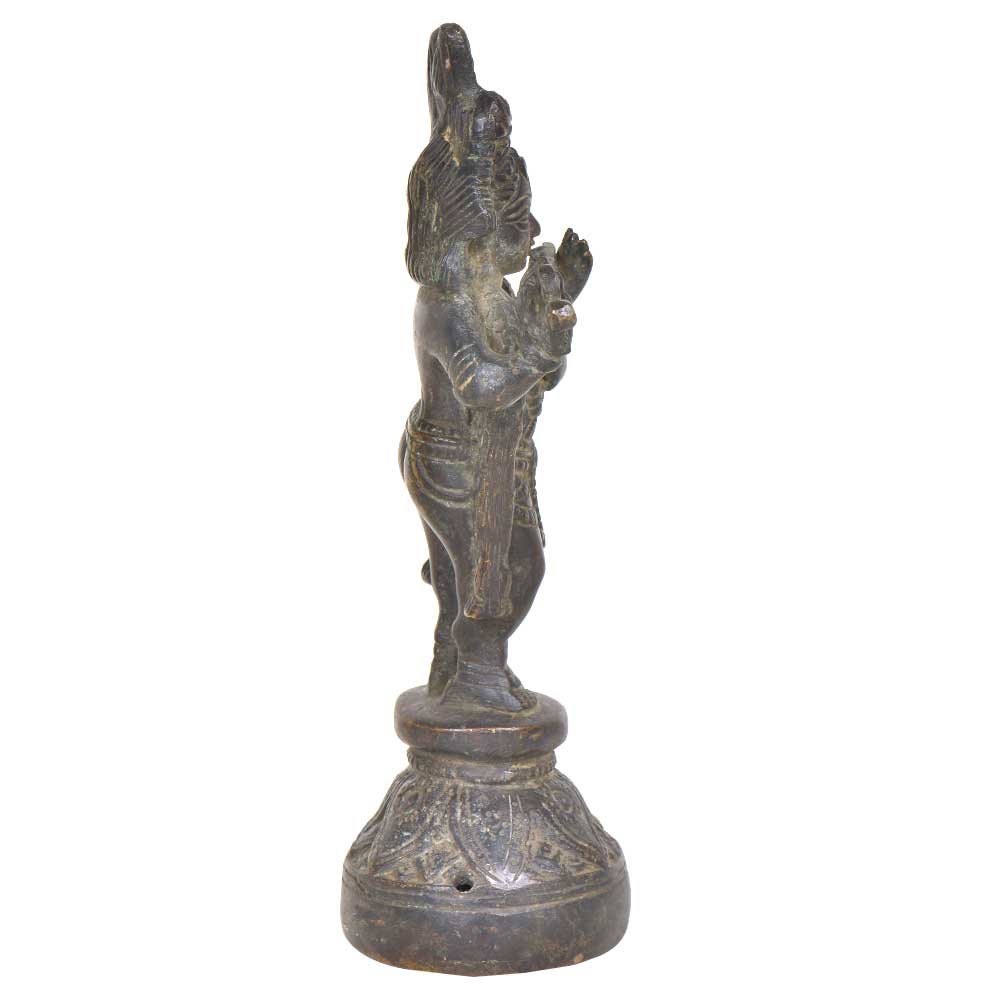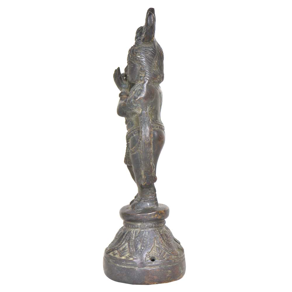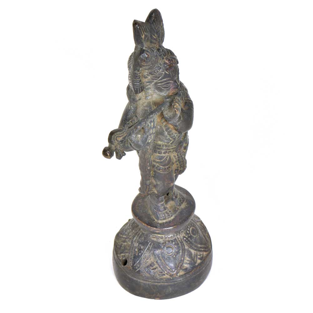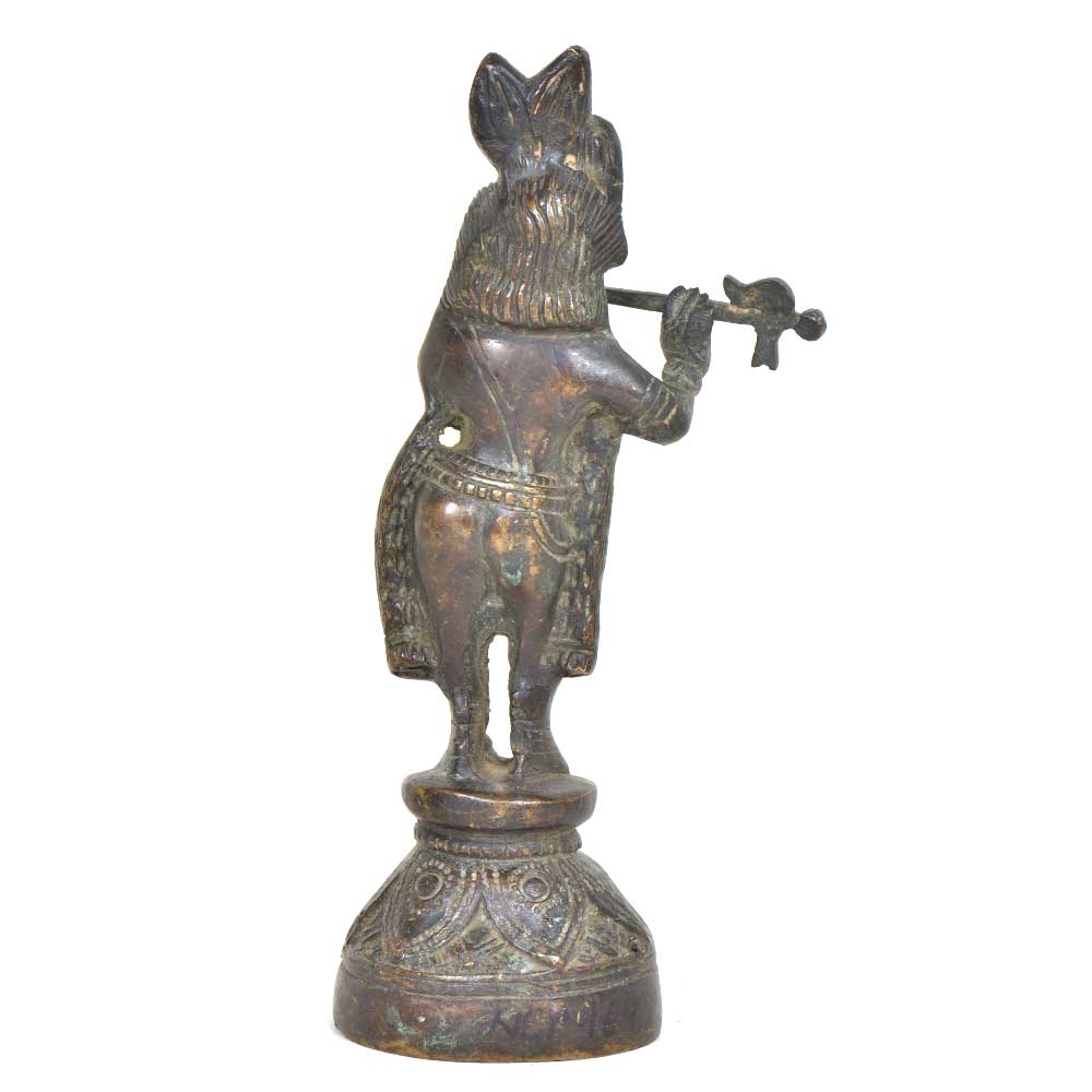 Handmade Brass Krishna finely done to get that peaceful expression on the face that fills the atmosphere with peace and positive energy. Krishna is standing with his right leg crossed over his left in his usual pose while playing the flute. His flute playing would beguile the cow herder's daughters whom were all in love with Krishna.