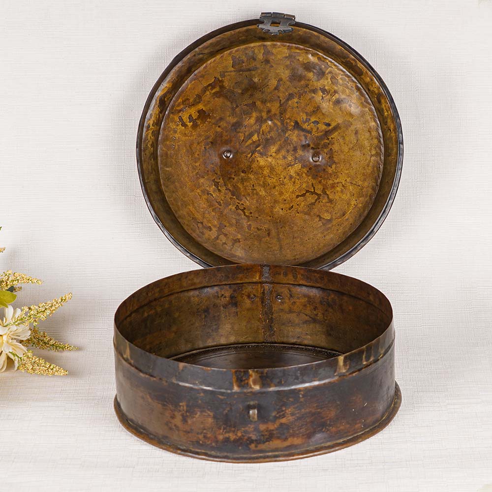 Buy our exquisite brass vintage jewelry box online that is a charming fusion of elegance and tradition. Crafted in a timeless round shape and finished in a captivating black hue, this small jewelry box exudes an aura of sophistication. It features a sturdy latch that securely closes the box, ensuring the safety of your precious accessories. The box is adorned with a delicately crafted handle on the top, allowing for easy transportation. Handmade by skilled Indian artisans, this antique brass jewelry box carries the legacy of their craftsmanship. Traditionally used to store jewelry in Indian households, it now presents itself as a versatile piece for various purposes. Display your jewelry collection, small keepsakes, or even use it as a captivating decorative item at exhibitions, museums, or your shop, hotel, or restaurant. This jewelry box for girls makes an incredible gift for your loved ones on special or festive occasions. Its rich historical essence and meticulous craftsmanship make it a cherished heirloom that will be treasured for generations. Embrace the charm of tradition with this captivating brass vintage jewelry box.