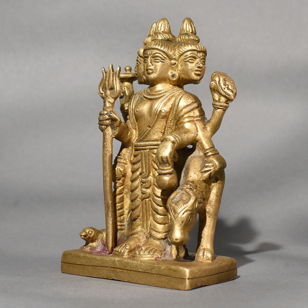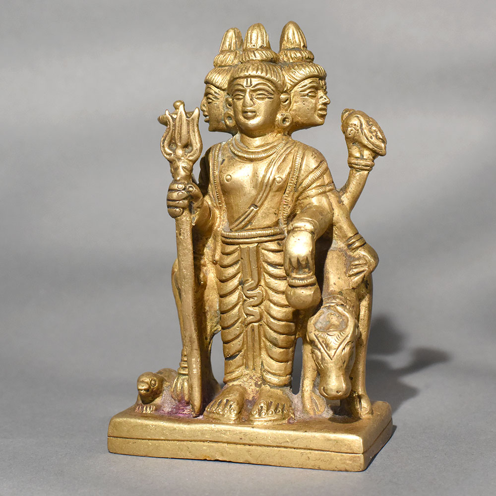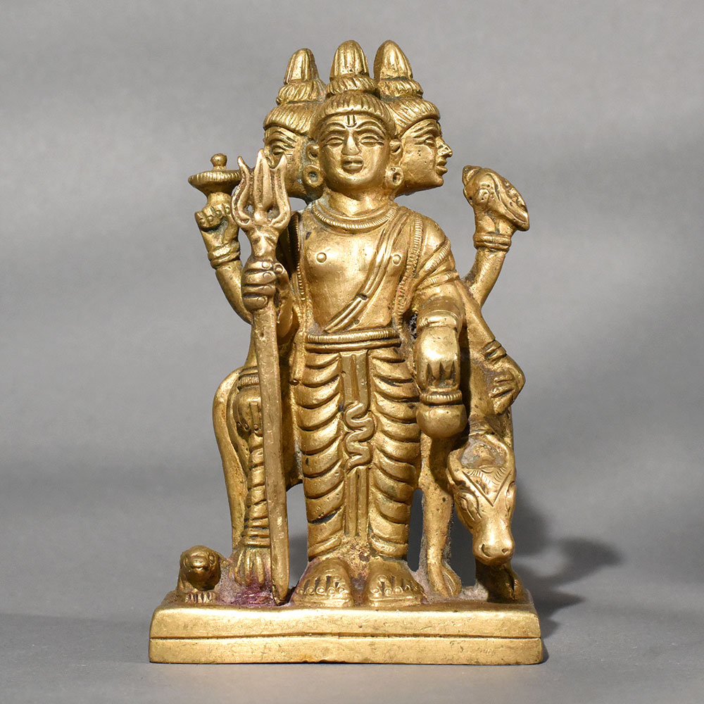 This handmade brass Lord Dattatreya statue is a sacred representation of the divine trinityBrahma, Vishnu, and Maheshunified in a single powerful form. Carefully crafted by skilled artisans, the sculpture features Lord Dattatreya with three serene faces symbolizing creation, preservation, and transformation. The detailed brass casting highlights traditional iconography, including the trident, kamandalu, and sacred attributes that reflect spiritual wisdom and ascetic balance. Made from solid brass, the statue carries a warm antique patina that enhances its devotional and vintage appeal. The fine detailing on the garments, facial expressions, and symbolic elements demonstrates exceptional craftsmanship and reverence for traditional temple art. The presence of the divine cow and attendants at the base further enriches the spiritual significance of the piece. Ideal for pooja rooms, meditation spaces, or spiritual dcor collections, this Lord Dattatreya statue serves as a symbol of enlightenment, protection, and harmony. It is also a meaningful gift for religious occasions, housewarmings, or collectors of sacred Indian art.