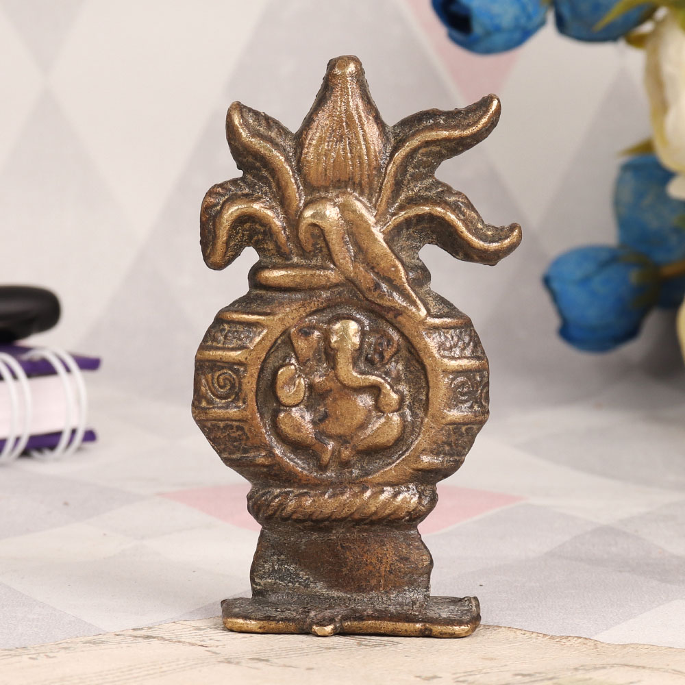 Elevate your spiritual space and showcase your reverence for Lord Ganesha with this exquisite Brass Lord Ganesha Kalash plate. Meticulously handcrafted by talented Indian artisans, this stunning piece boasts an antique brown finish, lending it an aura of timeless elegance. Crafted from high-quality brass, this Kalash plate is a symbol of artistic excellence and devotion. Its intricate design captures the essence of Lord Ganesha's divine grace, making it a perfect addition to your home, office, restaurant, hotel, or cafe. Place it in your prayer room to enhance the ambiance of worship, radiating positive energy. This piece transcends its spiritual significance, making it a valuable addition to any vintage collection. Its antique brown finish adds an air of authenticity, making it suitable for display in museums and exhibitions, where it can narrate a story of India's rich cultural heritage. Furthermore, this Brass Lord Ganesha Kalash plate serves as a thoughtful and meaningful gift for your loved ones on special, festive, or auspicious occasions.