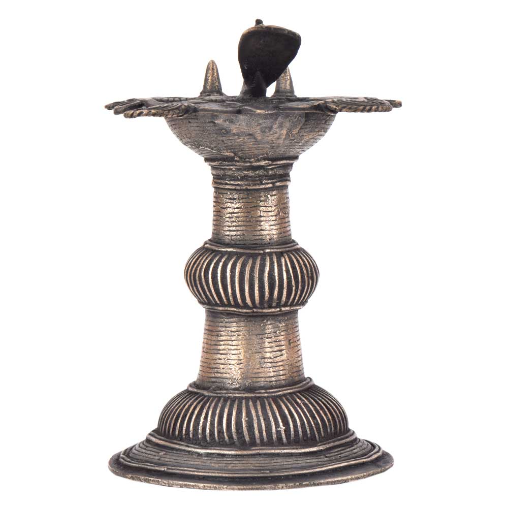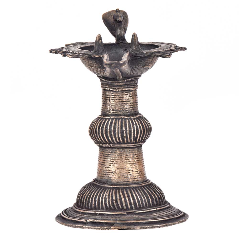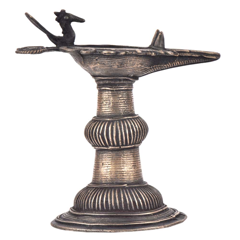 Handcrafted using old lost wax technique primarily practiced in Orrisa and West Bengals by the local or tribal artisans. In this technique the molten wax is poured into desired clay mould and when the wax melts the clay is broken and we get the desired metal object which is further polished to perfection. The Deep Cup Can Be Filled with Oil and Light a Cotton Wick. Diyas/ Oil Lamps are Considered Auspicious as in Hindu Religion. It is detailed with Elephant and Peacock Animals with Beautiful Details.