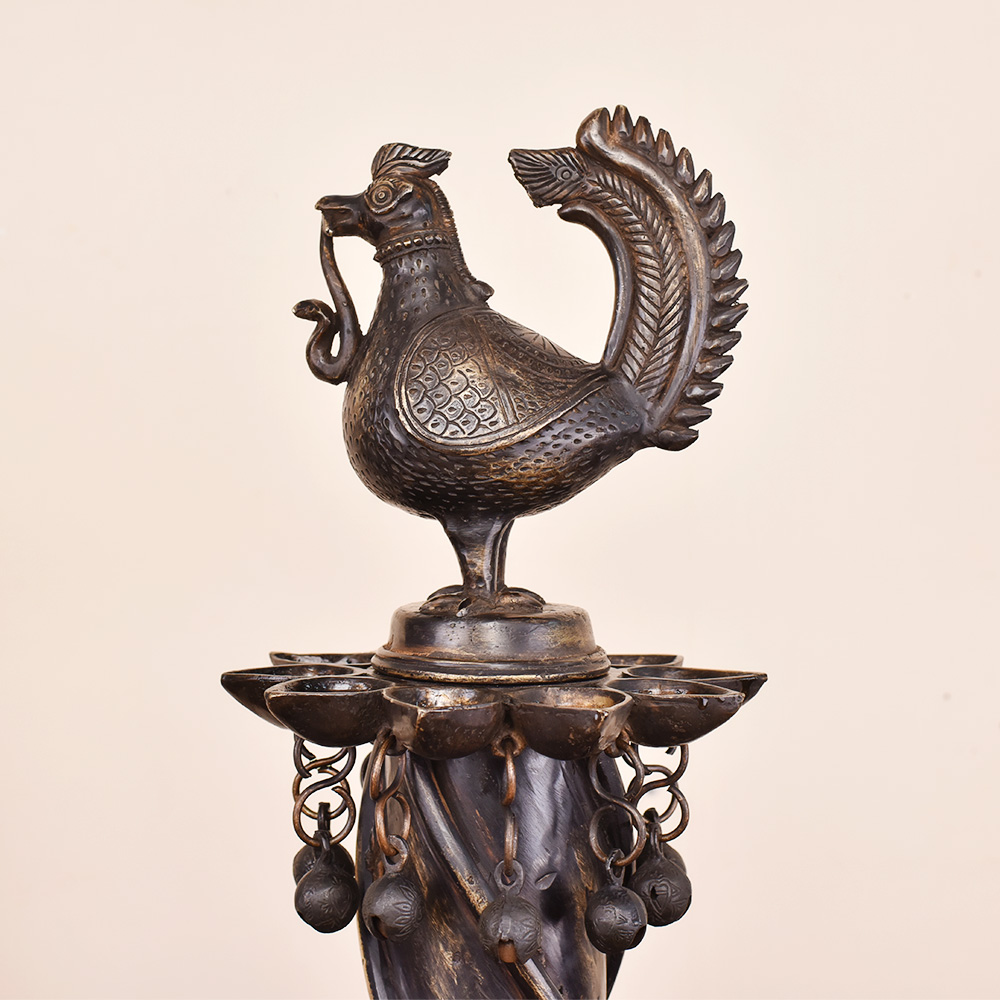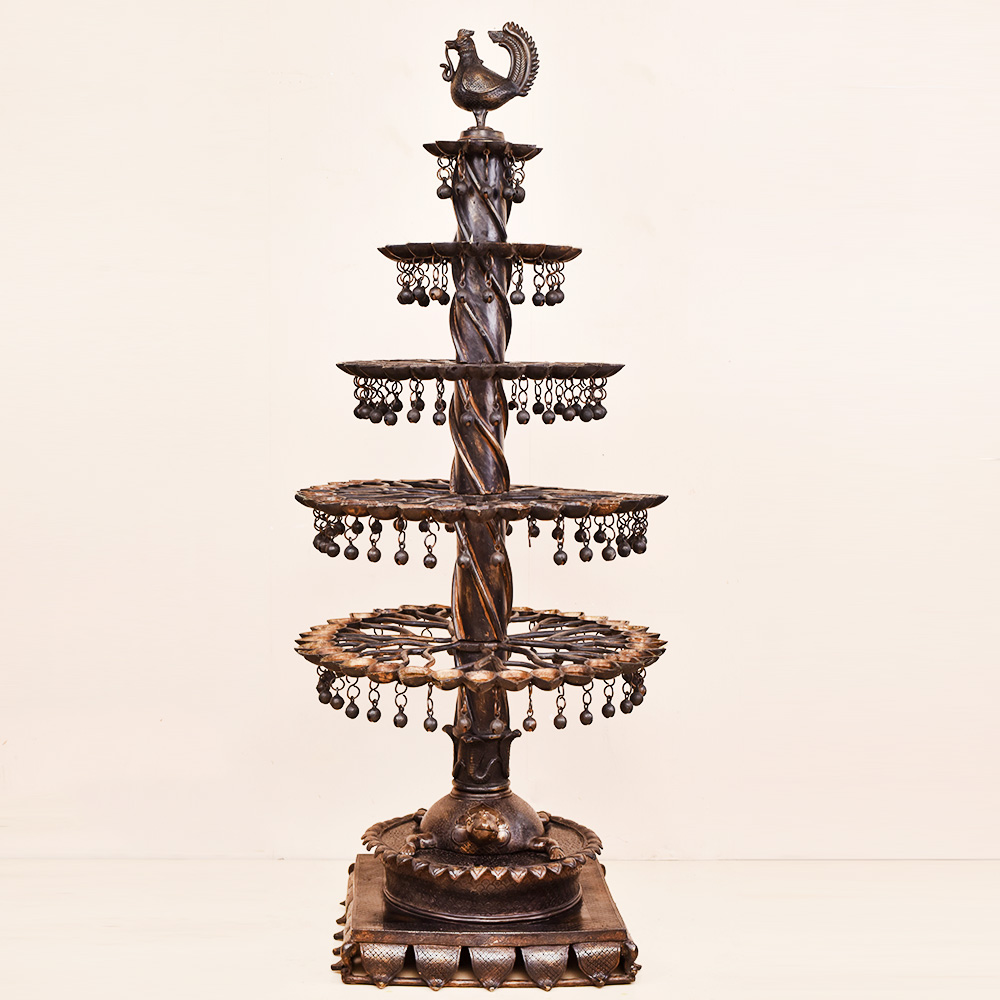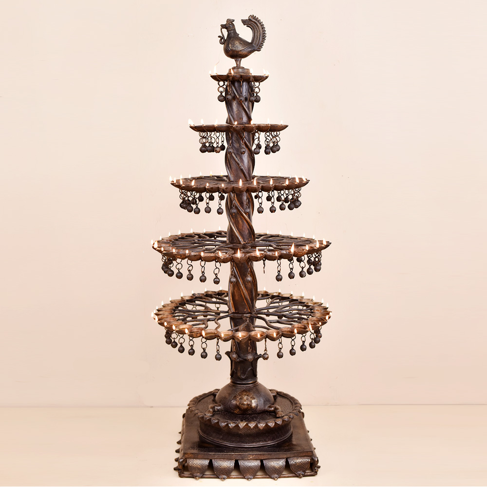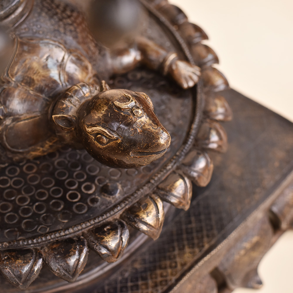 A brass oil lamp that has been crafted by highly skilled and experienced Indian craftsmen, following the rich traditions of South Indian Art. The lamp has multiple Jyots, with five floors that can be lit using mustard oil or desi ghee and cotton wicks. This allows for a bright and warm glow that is perfect for special occasions or simply for decoration. The lamp's unique design is what makes it truly special. A peacock has been intricately carved on the top of the lamp. A turtle has been carved at the bottom of the lamp, holding the oil lamps on its shell-like structure. The base below the turtle ensures that the lamp can be placed safely on any surface. The combination of the peacock and the turtle creates an eye-catching design that is both symbolic and aesthetic. In Indian culture, the peacock is considered a symbol of beauty, love, and prosperity, while the turtle represents stability and longevity. This brass oil lamp is an incredible gift to your loved ones on special or festive occasions. It will be cherished by your loved ones for its beauty, symbolism, and craftsmanship. Overall, this brass oil lamp is a testament to the rich heritage and culture of India, and a perfect addition to any home or occasion.