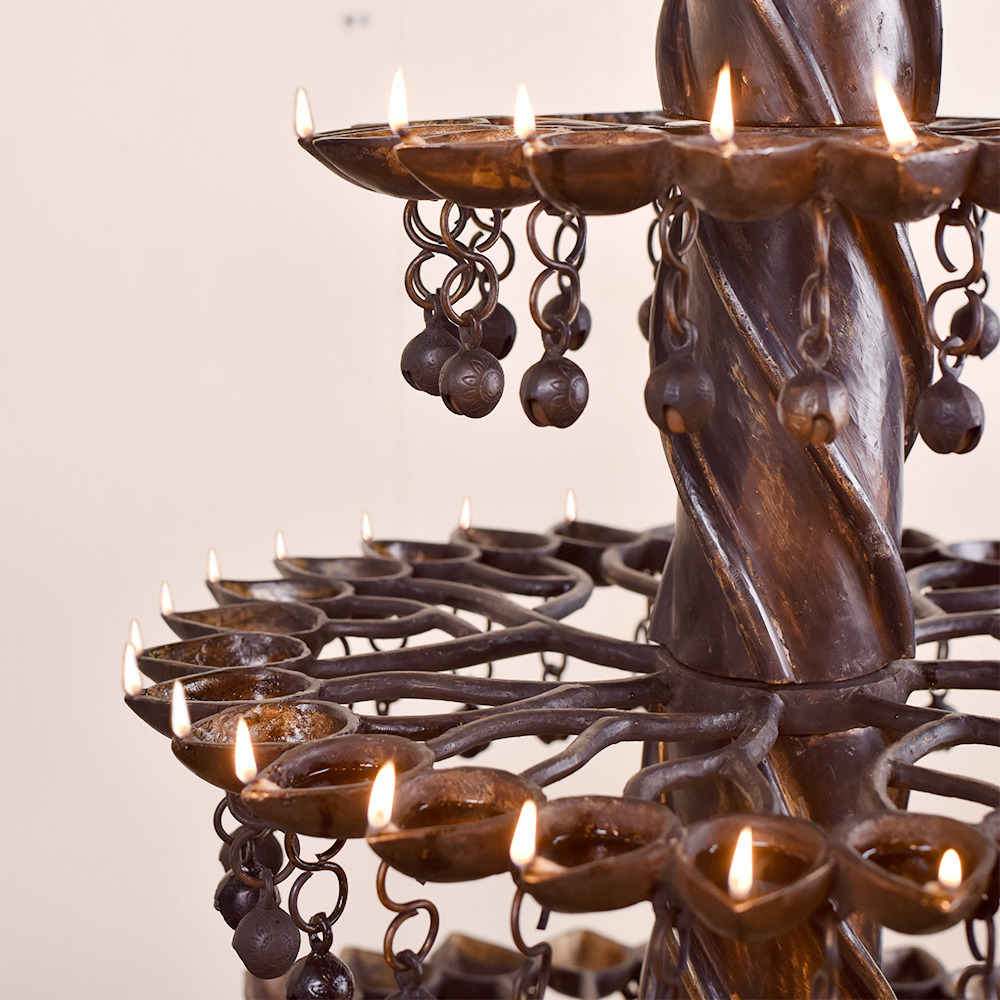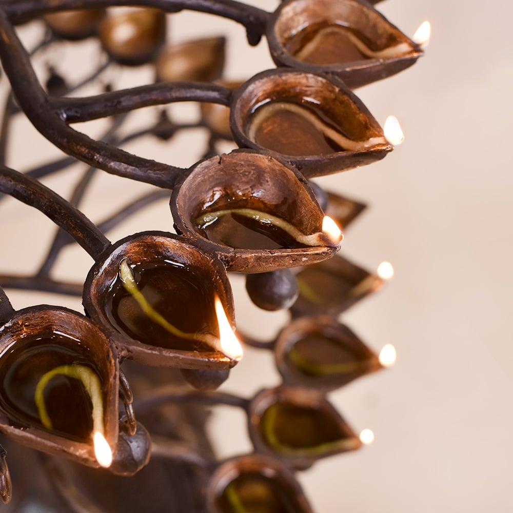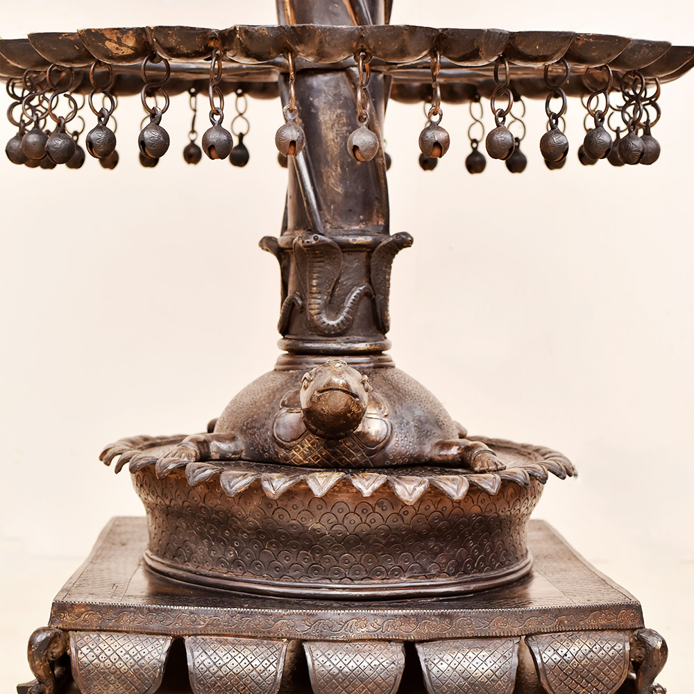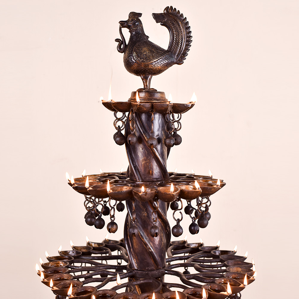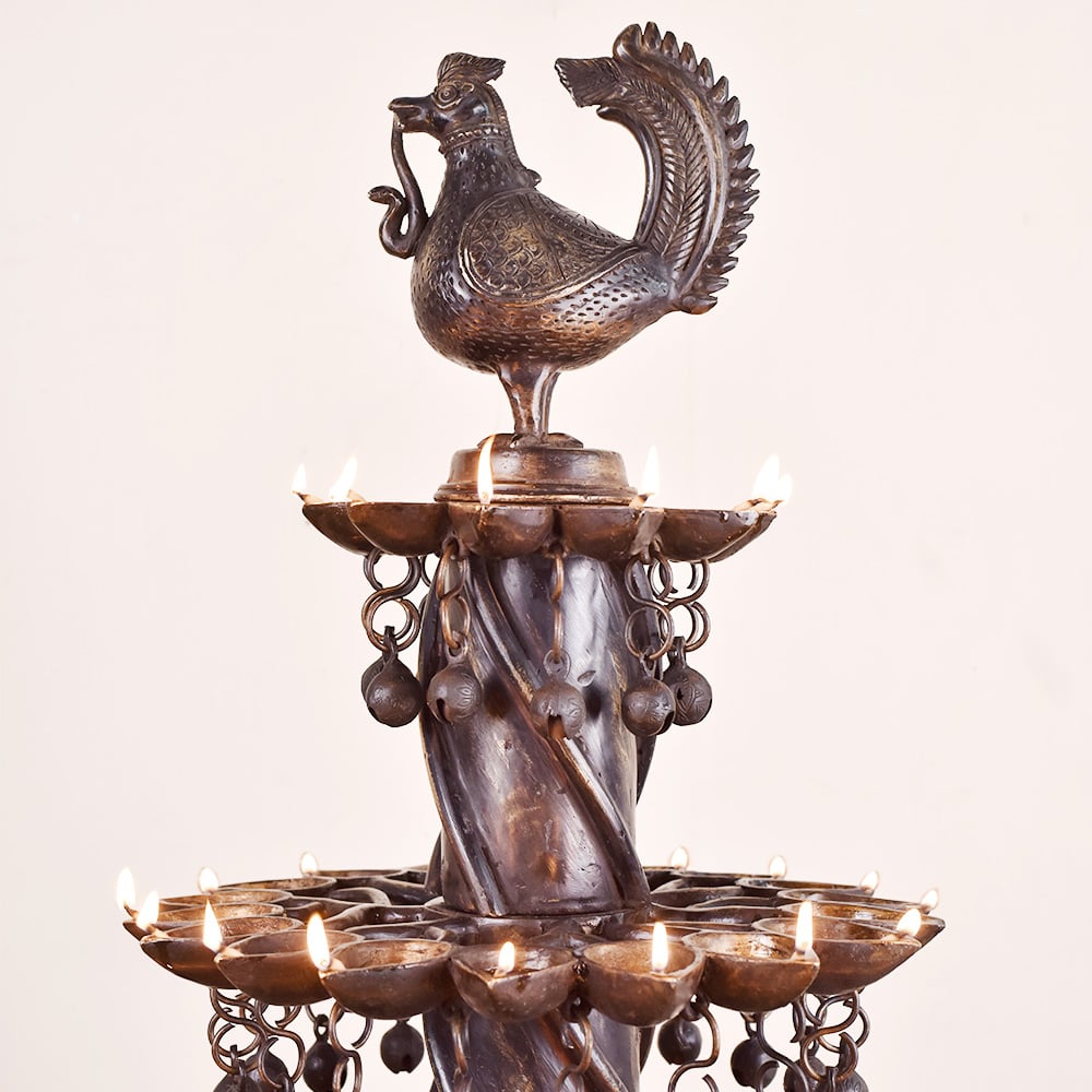A brass oil lamp that has been crafted by highly skilled and experienced Indian craftsmen, following the rich traditions of South Indian Art. The lamp has multiple Jyots, with five floors that can be lit using mustard oil or desi ghee and cotton wicks. This allows for a bright and warm glow that is perfect for special occasions or simply for decoration. The lamp's unique design is what makes it truly special. A peacock has been intricately carved on the top of the lamp. A turtle has been carved at the bottom of the lamp, holding the oil lamps on its shell-like structure. The base below the turtle ensures that the lamp can be placed safely on any surface. The combination of the peacock and the turtle creates an eye-catching design that is both symbolic and aesthetic. In Indian culture, the peacock is considered a symbol of beauty, love, and prosperity, while the turtle represents stability and longevity. This brass oil lamp is an incredible gift to your loved ones on special or festive occasions. It will be cherished by your loved ones for its beauty, symbolism, and craftsmanship. Overall, this brass oil lamp is a testament to the rich heritage and culture of India, and a perfect addition to any home or occasion.
