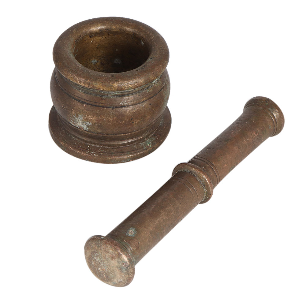Add an ethnic touch to your living room or kitchen with this incredible antique finish mortar and pestle set. This spice grinder is hand carved from a brass metal alloy, making it even more reliable and sturdy. It has been used in Indian kitchens for centuries to grind spices and chutney (sauce). In ancient times, vaid or vaidya used to make Ayurvedic medicine with pestle and mortar. Even today, various Ayurvedic doctors use pestles and mortars to make medicines. Beautify your living room with an attractive pestle and mortar.