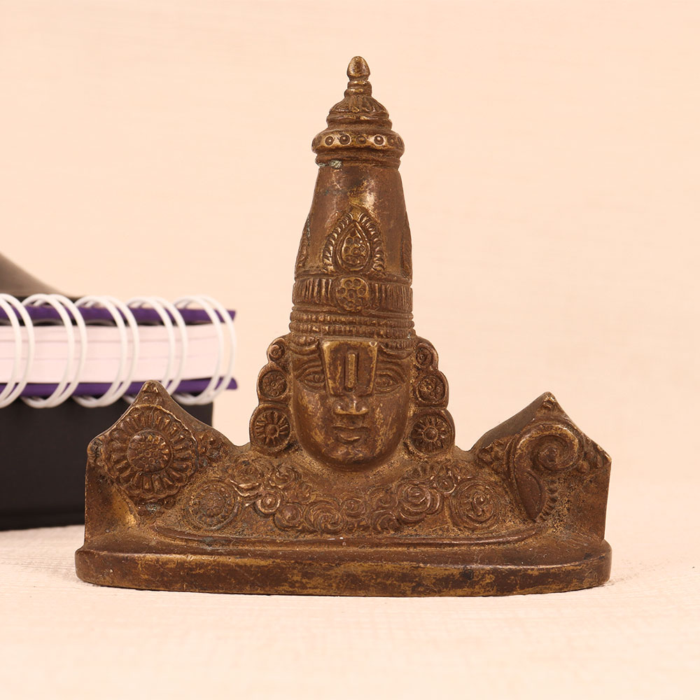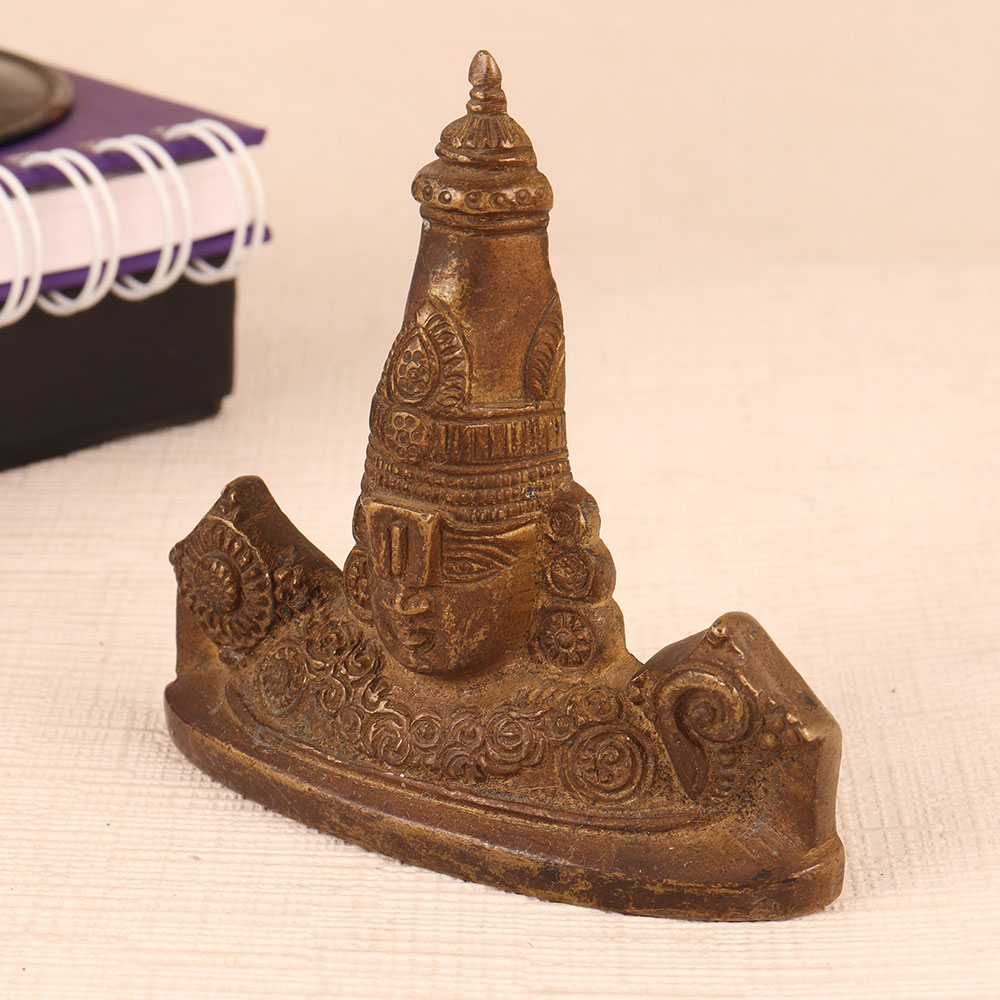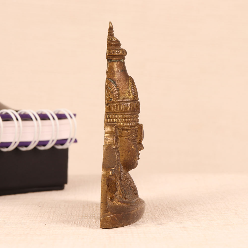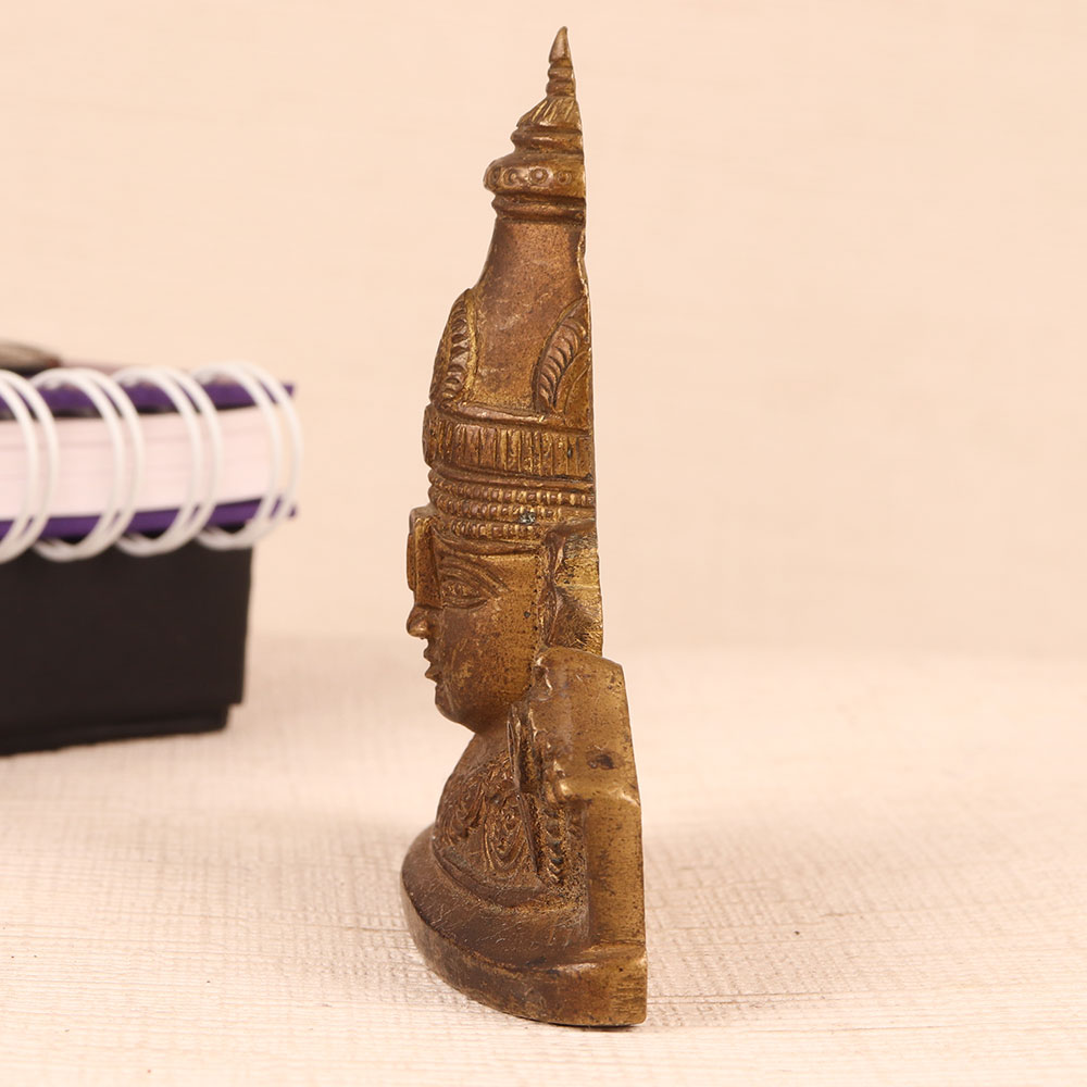 Adorn your interior with the divine presence of Lord Vishnu through this exquisite brass wall hanging. Crafted with meticulous detail, this piece features the resplendent head of Lord Vishnu adorned with his iconic attributes, the Shankha and Chakra. Its antique brown finish lends an aura of timeless elegance. Each of these remarkable pieces is handcrafted by highly skilled and experienced Indian artisans using high-quality brass, ensuring not only its stunning appearance but also its durability. The artistry and craftsmanship behind this piece make it a true work of devotion and dedication. This Lord Vishnu wall hanging is a versatile addition to your living or work environment. Place it in your home, office, restaurant, hotel, cafe, or shop's prayer room to create a serene and spiritually uplifting ambiance. Its aesthetic charm also makes it a valuable addition to any vintage collection, captivating collectors and enthusiasts alike. Furthermore, this exquisite piece makes for a thoughtful and meaningful gift for your loved ones on special, festive, or auspicious occasions.