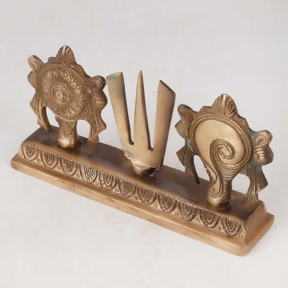 Buy a Brass Shankh Chakra Namah online that is a true testament to craftsmanship and artistry. This beautiful piece is meticulously handcrafted by highly skilled Indian artisans using high-quality brass, ensuring its durability and timeless appeal. Its antique golden finish exudes an air of elegance and sophistication, making it a perfect addition to any decor style. This Shankh Chakra Namah holds deep cultural significance as it symbolizes prosperity, spirituality, and divine blessings. Its unique design features intricate detailing, capturing the essence of Indian traditions and spirituality, making it a conversation starter and an eye-catching display for any home, office, restaurant, hotel, or cafe. Versatility is another hallmark of this masterpiece. Whether you want to enhance the ambiance of your living space or create an alluring display at exhibitions or vintage collections, the Brass Shankh Chakra Namah serves as a captivating centerpiece. Furthermore, this extraordinary piece makes an ideal gift for your loved ones on special or festive occasions. Its inherent cultural value and impeccable craftsmanship will surely be cherished and appreciated by those who receive it. Immerse yourself in the richness of Indian culture and spirituality with the Brass Shankh Chakra Namah, a timeless masterpiece that will add grace and charm to any setting.