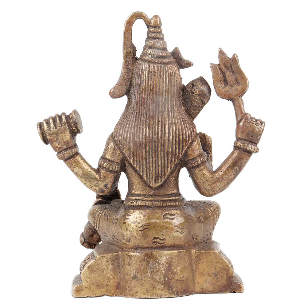 Handmade brass shiva statue in meditation eyes closed with four arms holding damru, Trishul kamandal and blessing pose . The creator, destroyer and preserver wears a cobra around his neck and sits on lotus base. Ganga starting from his head this statue is a home decoration statue, wedding decoration, gift for near and dear ones on Birthdays, New Year and Diwali.