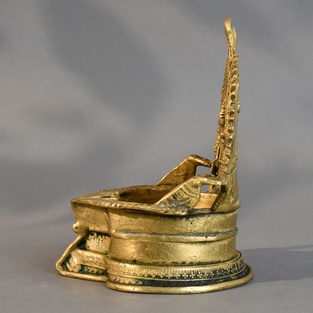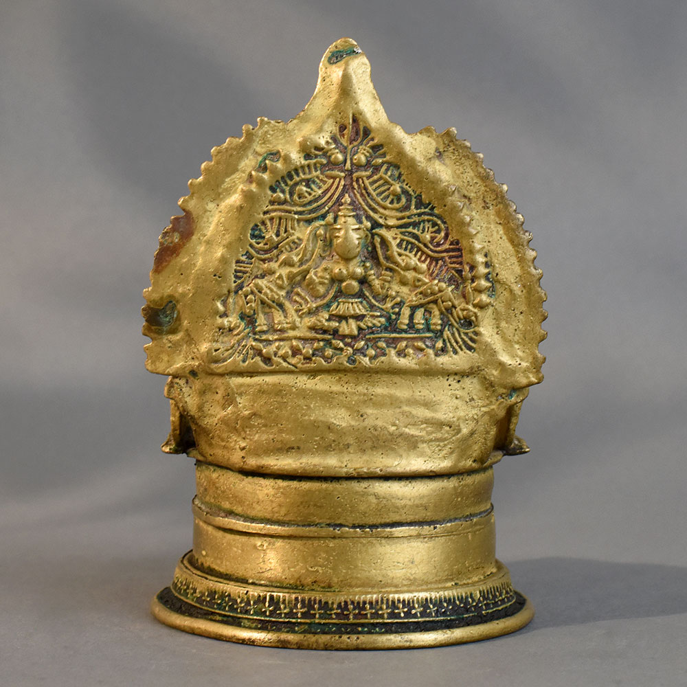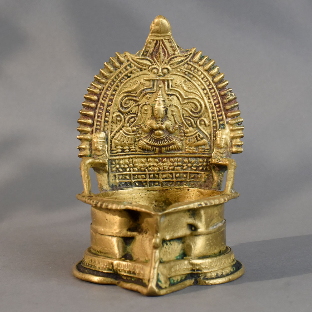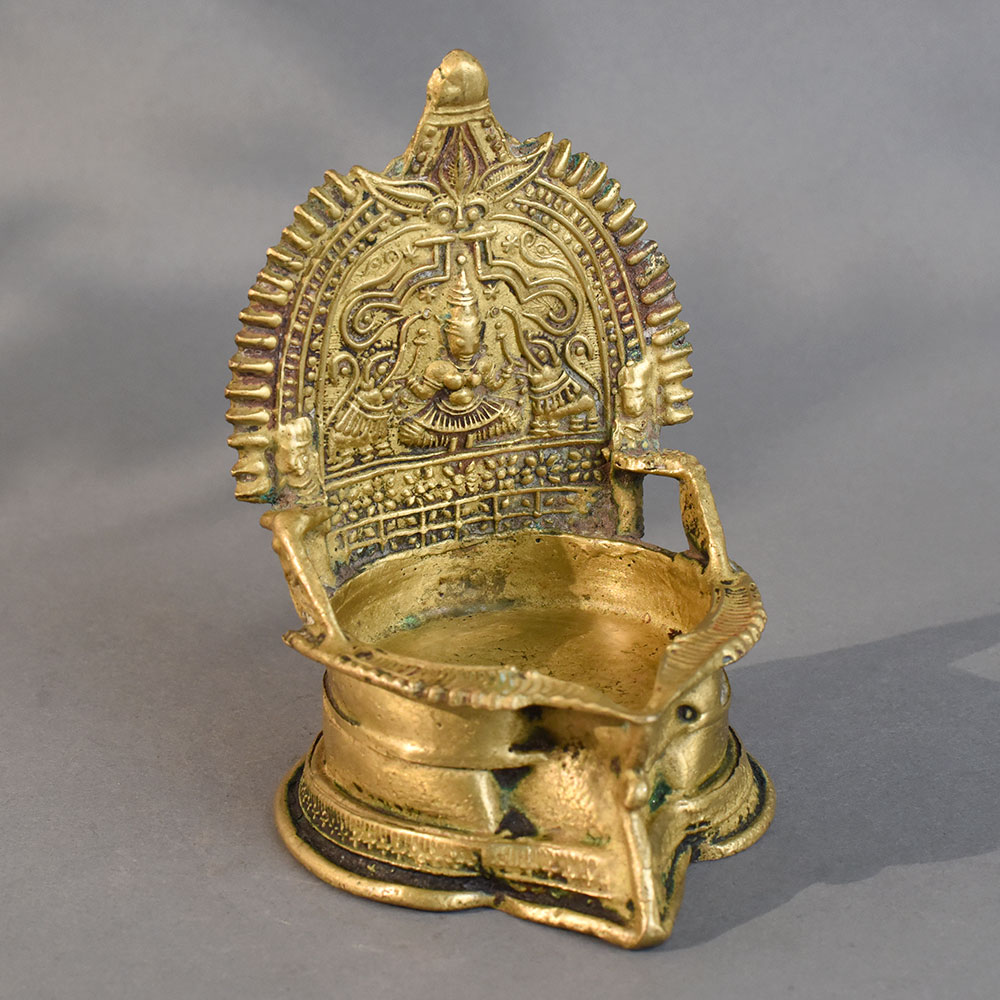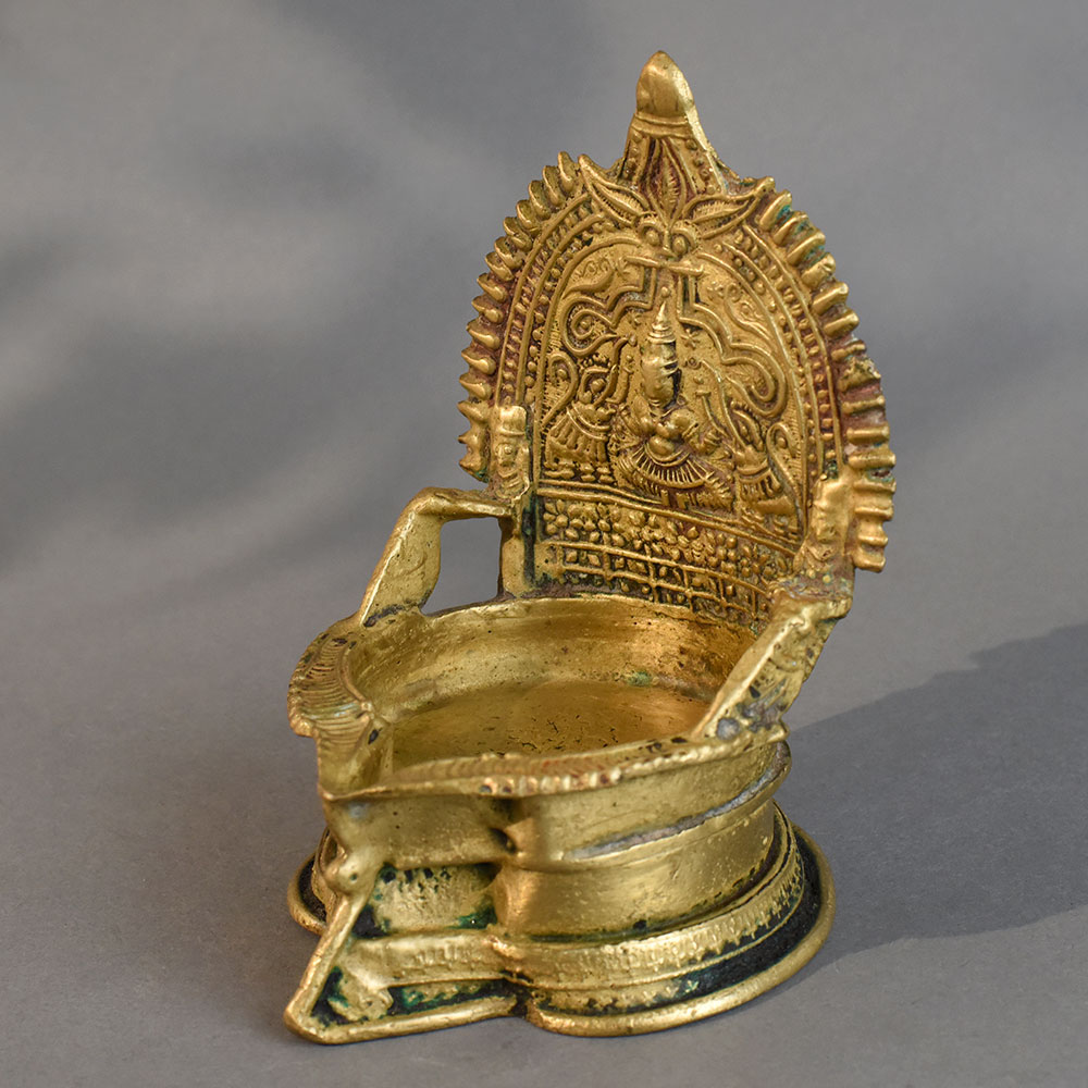 - Handmade brass diya with intricate South Indian temple art design
