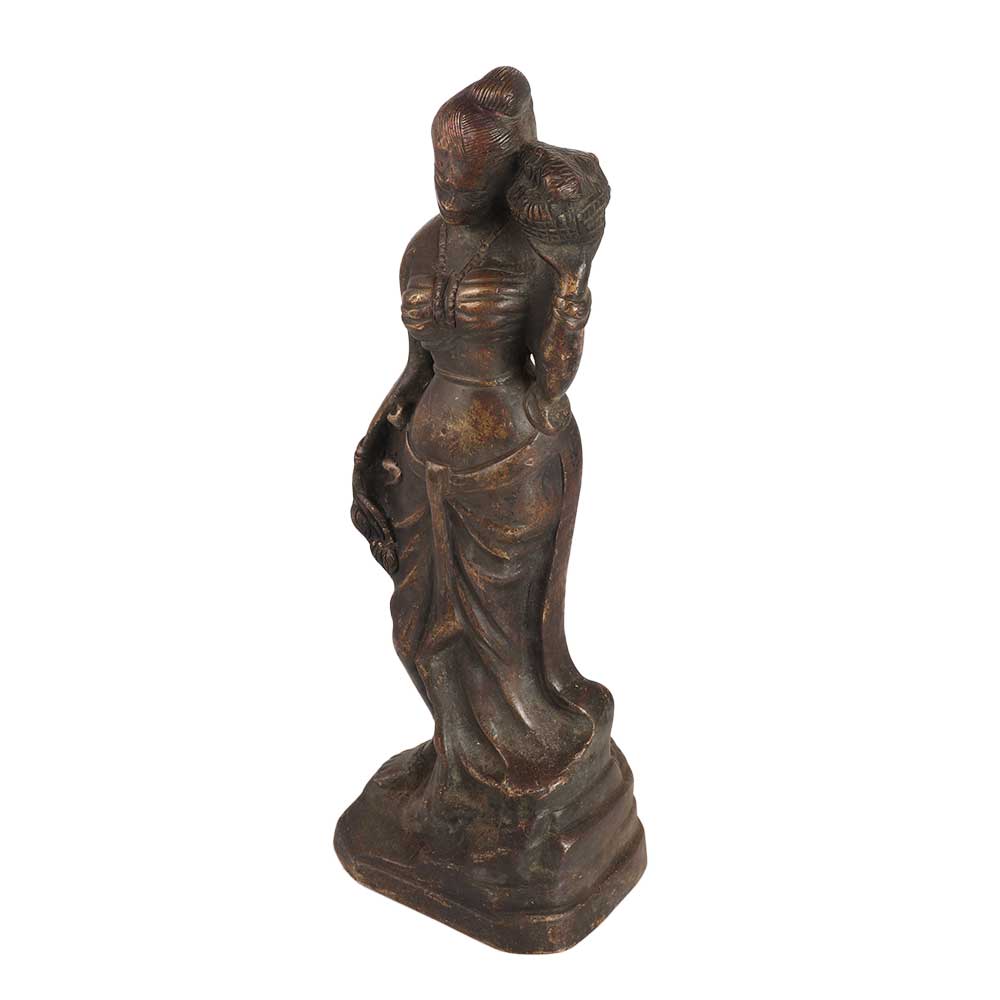 Buy a captivating statue that features a lady standing gracefully, holding a pot in her left hand. The statue is made with exquisite attention to detail and finished in a dark hue, creating a stunning visual impact. It is an ideal choice for decorating any space, including homes, offices, restaurants, hotels, cafes, and shops, and is perfect for collectors. The statue showcases the beauty and elegance of a lady, with intricate detailing capturing every curve and feature. It can also be an excellent addition to a collection, making it a valuable and treasured item. Whether for decoration or collection, this statue is a beautiful work of art that can be appreciated and admired by all. You can gift this statue to your loved ones on special and festive occasions.