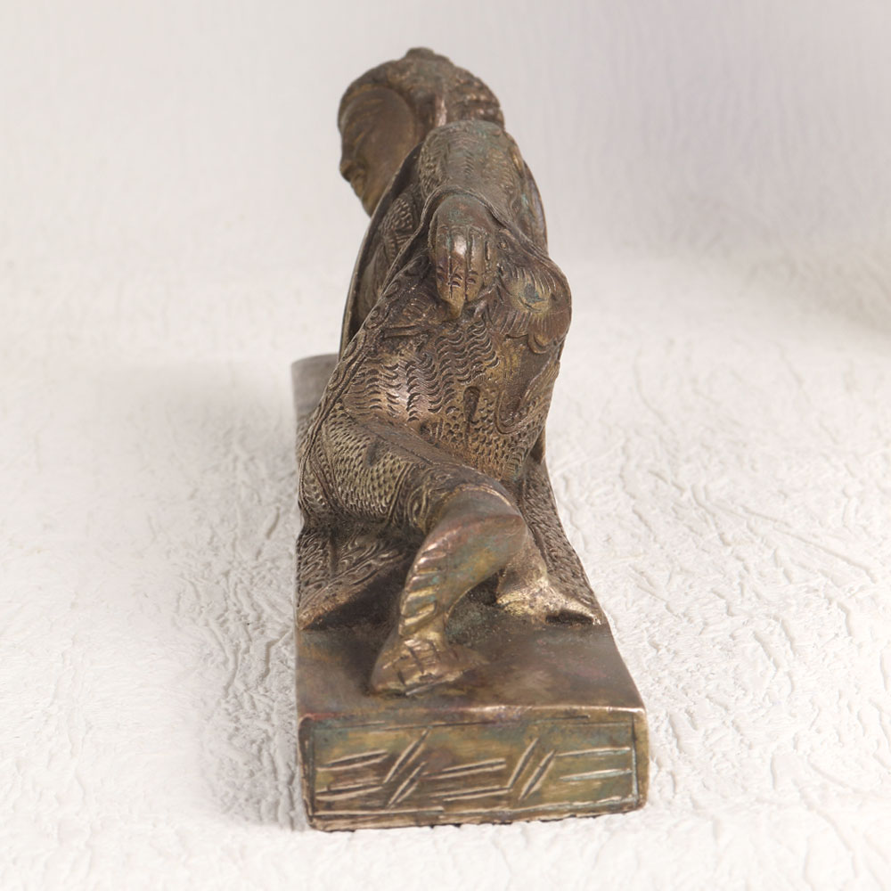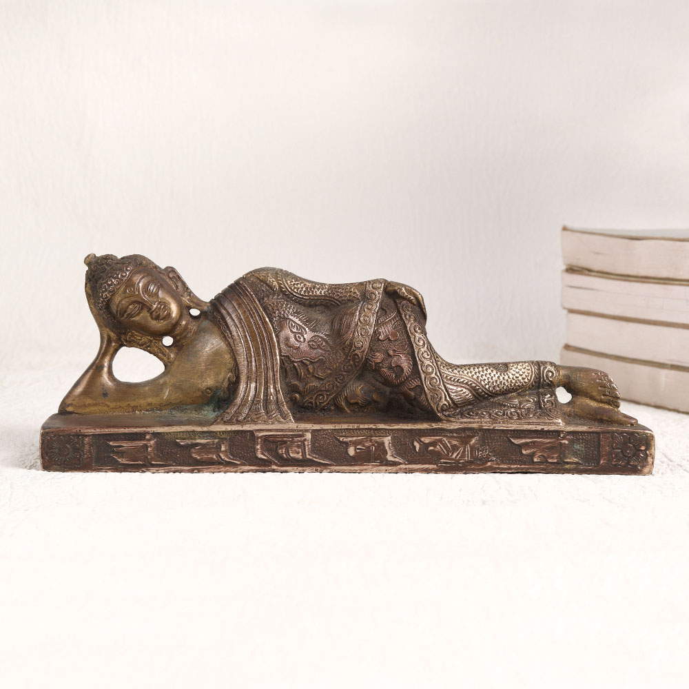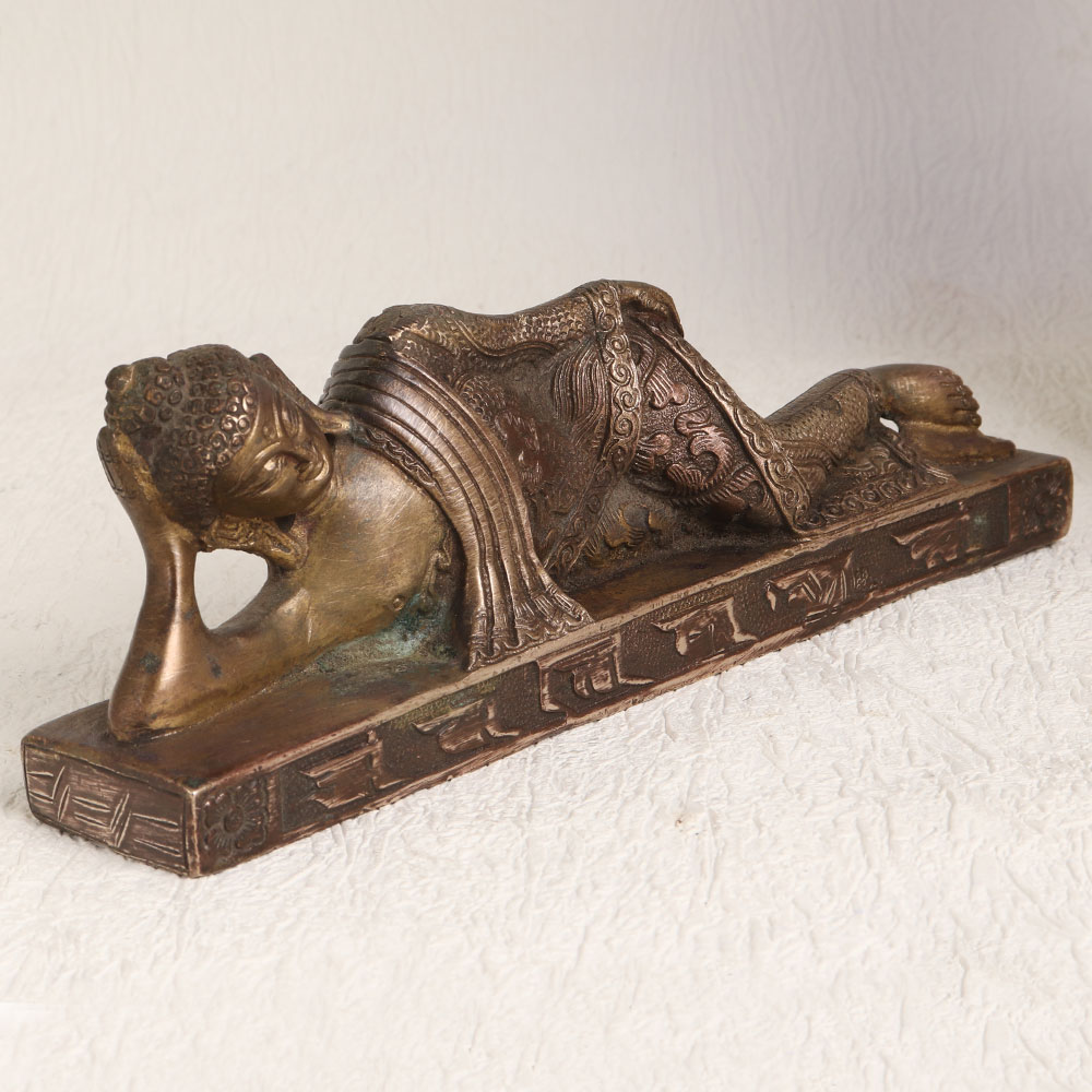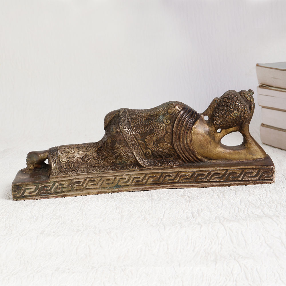 Enhance your space with the serene presence of our exquisite brass statue of Buddha in a peaceful slumber. This stunning piece of art is handcrafted by professional Chinese artisans which boasts a rich antique brown finish that adds warmth and character to any setting. Crafted with meticulous attention to detail, it captures the essence of tranquillity and spiritual serenity. Made from high-quality brass, this Buddha statue exudes a timeless elegance that suits various decor styles. Its versatility makes it a perfect addition to your home, office, restaurant, hotel, cafe, or shop, enhancing the ambiance and radiating a sense of calm. Whether you're an avid collector of vintage treasures or planning to showcase it at an exhibition, this statue is a captivating conversation starter. It embodies the craftsmanship of a bygone era while remaining relevant in contemporary settings. Celebrate special, festive, or auspicious occasions by gifting this remarkable Buddha statue to your loved ones. Its profound symbolism and timeless beauty make it a meaningful gesture that will be cherished for years to come.