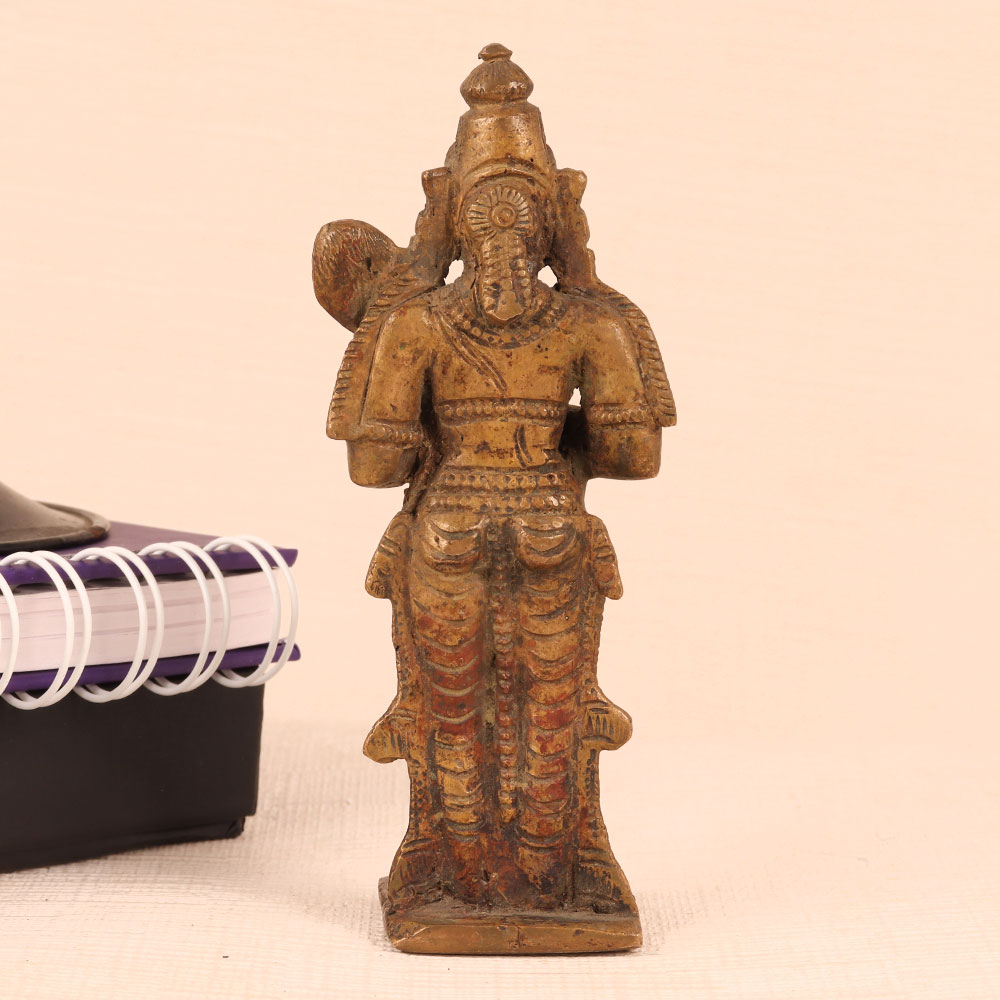 Elevate your space with the timeless beauty and spiritual significance of this exquisite brass statue of a Hindu God. Handcrafted to perfection by professional Indian artisans, this stunning piece boasts intricate details and a rich antique brown finish that exudes an aura of authenticity and heritage. Standing proudly on a platform, this South Indian Art-inspired masterpiece is crafted from high-quality brass, a material known for its durability and timeless appeal. Its regal presence makes it a perfect addition to your home, office, restaurant, hotel, cafe, or shop's prayer room, where it can serve as a focal point for worship and decoration. For collectors of vintage treasures, this brass statue is a must-have addition to your curated collection, representing both artistic mastery and spiritual significance. Additionally, it makes for an exceptional gift choice for your loved ones on special, festive, or auspicious occasions, imparting blessings, beauty, and a touch of tradition to their lives.
